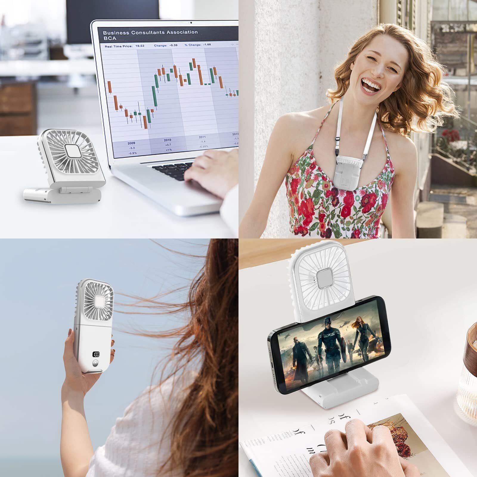 Ventilator Portabil , 3 in 1, de Mana, de Gat, de Birou, 16.7 x 8 x 1.9 cm, 3 Trepte de Viteza, Incarcare USB, Pliabil, Afisaj Digital, Suport Telefon, Alb