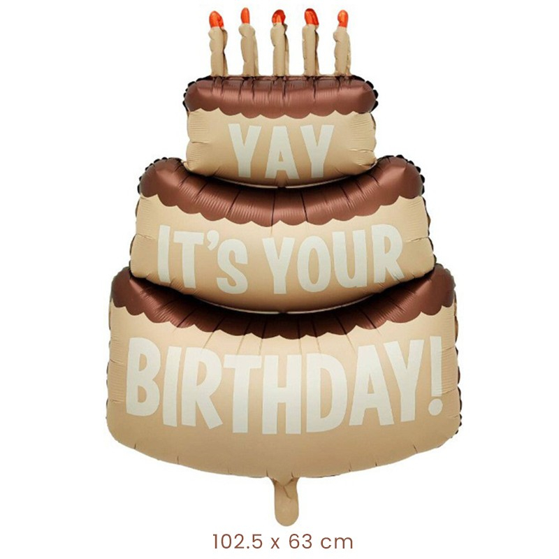 Balon din Folie Metalizata, , Figurina Animata, Model Tort Aniversar, 102.5 x 63 cm, Ambalaj Individual, Pai Inclus, Umflare cu Aer sau Heliu, Maro