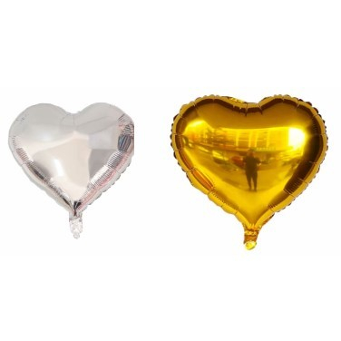 Set 2 Baloane din Folie Metalizata, , Model Inimi, Tema Ziua Indragostitilor, 45 cm, Ambalaj Individual, Pai Inclus, Umflare cu Aer sau Heliu, Argintiu/Auriu