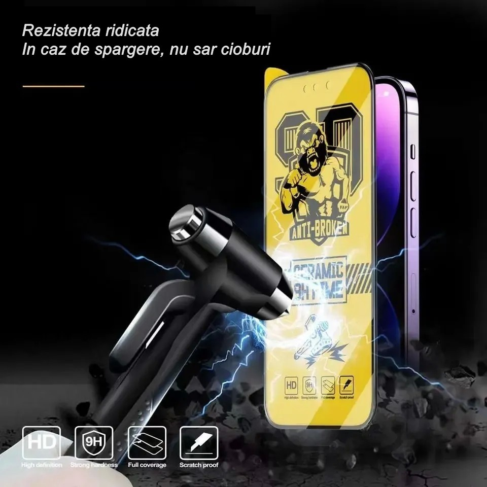 Folie de protectie Ceramic Film conceputa special pentru Apple iPhone 15 Pro Max este confectionata din TPU+PMMA ( Poly(methyl methacrylate) si acopera in intregime display-ul telefonului.