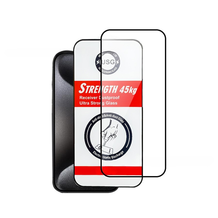 Folie de Protectie, , pentru iPhone 15 Pro, Tempered Glass USG, Ultra Rezistent 45kg, Full Cover, Antistatica, Margini Negre, Transparent