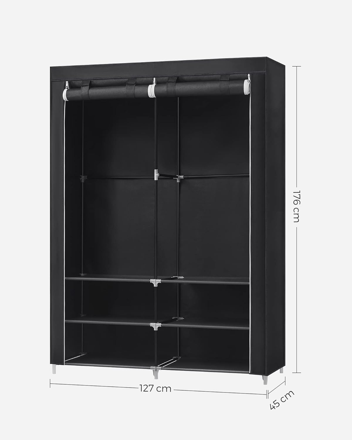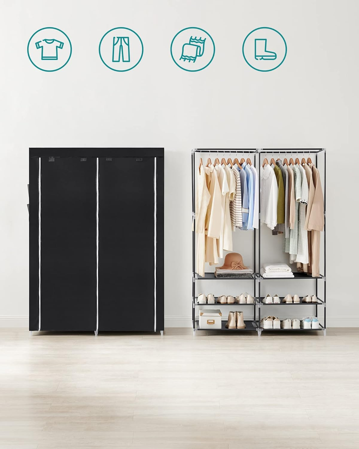 SONGMICS Dulap textil garderoba, 2 compartimente haine cu rafturi, cadru metalic, 127x45x176 cm, negru