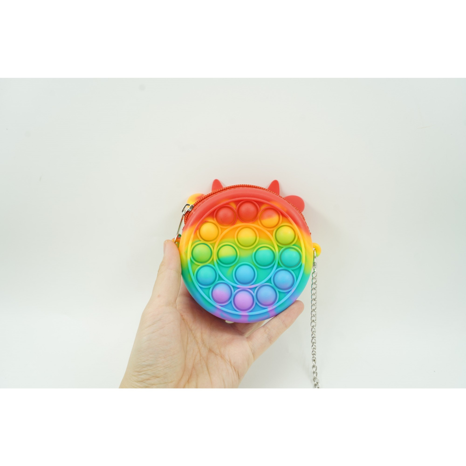 Jucarie antistres din silicon , Pop it Now and Flip It ,Mini Geanta, Vacuta, 6 cm, Curcubeu