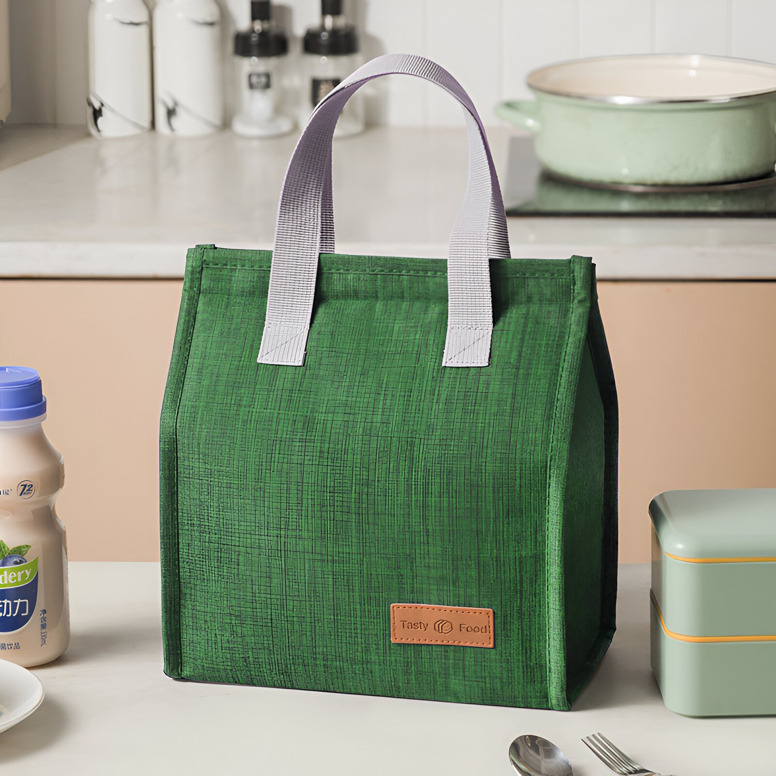Geanta termoizolanta tip bento bag , camping cooler bag, Aluminiu, 22.5 x 13 x 25,5 cm, 3.3 L, Verde