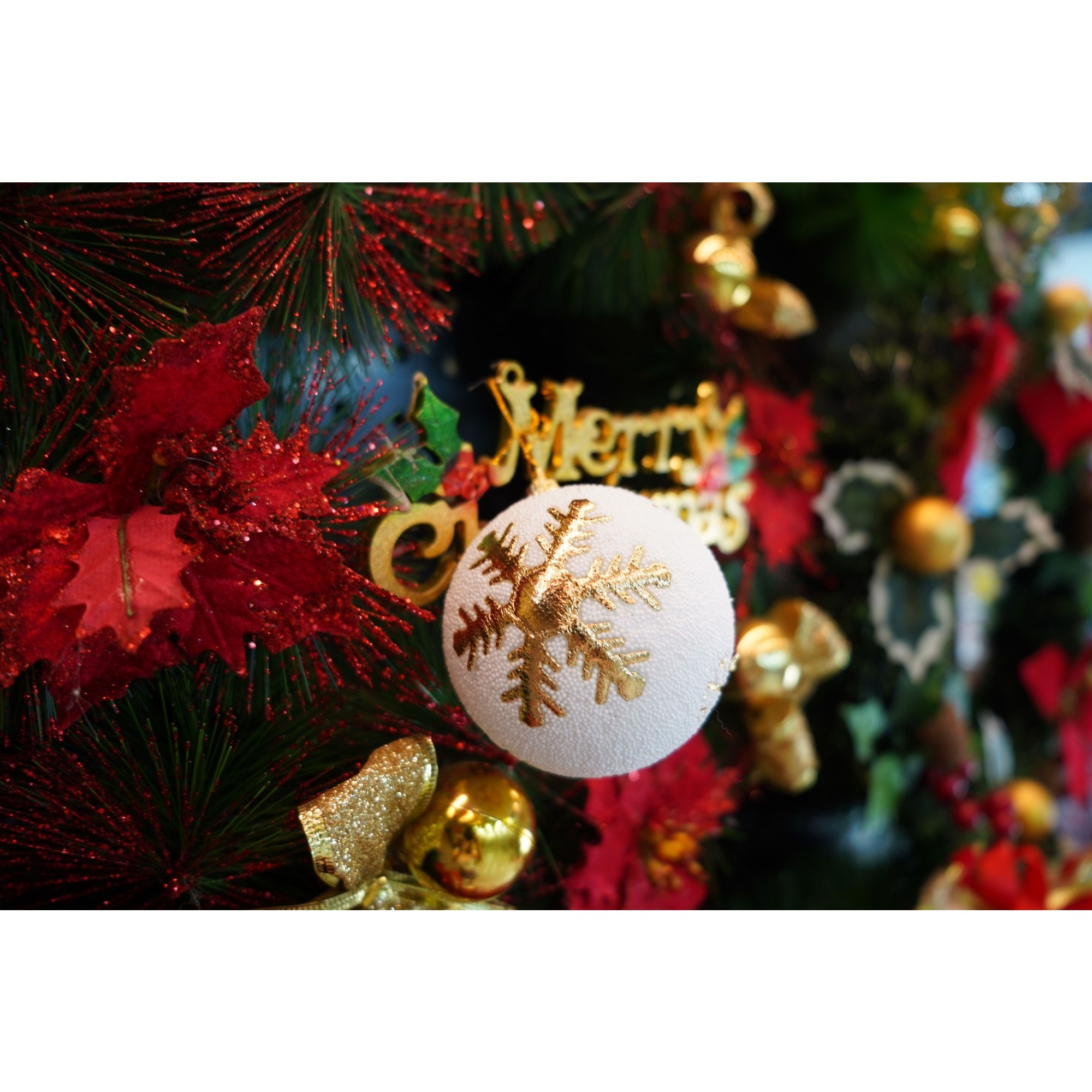 Set de 12 ornamente de brad, , de tip Glob, Alb/ Rosu, din polistiren, cu finisaj sclipitor , cutie 8 cm adancime x 32 cm lungime x 24 cm inaltime