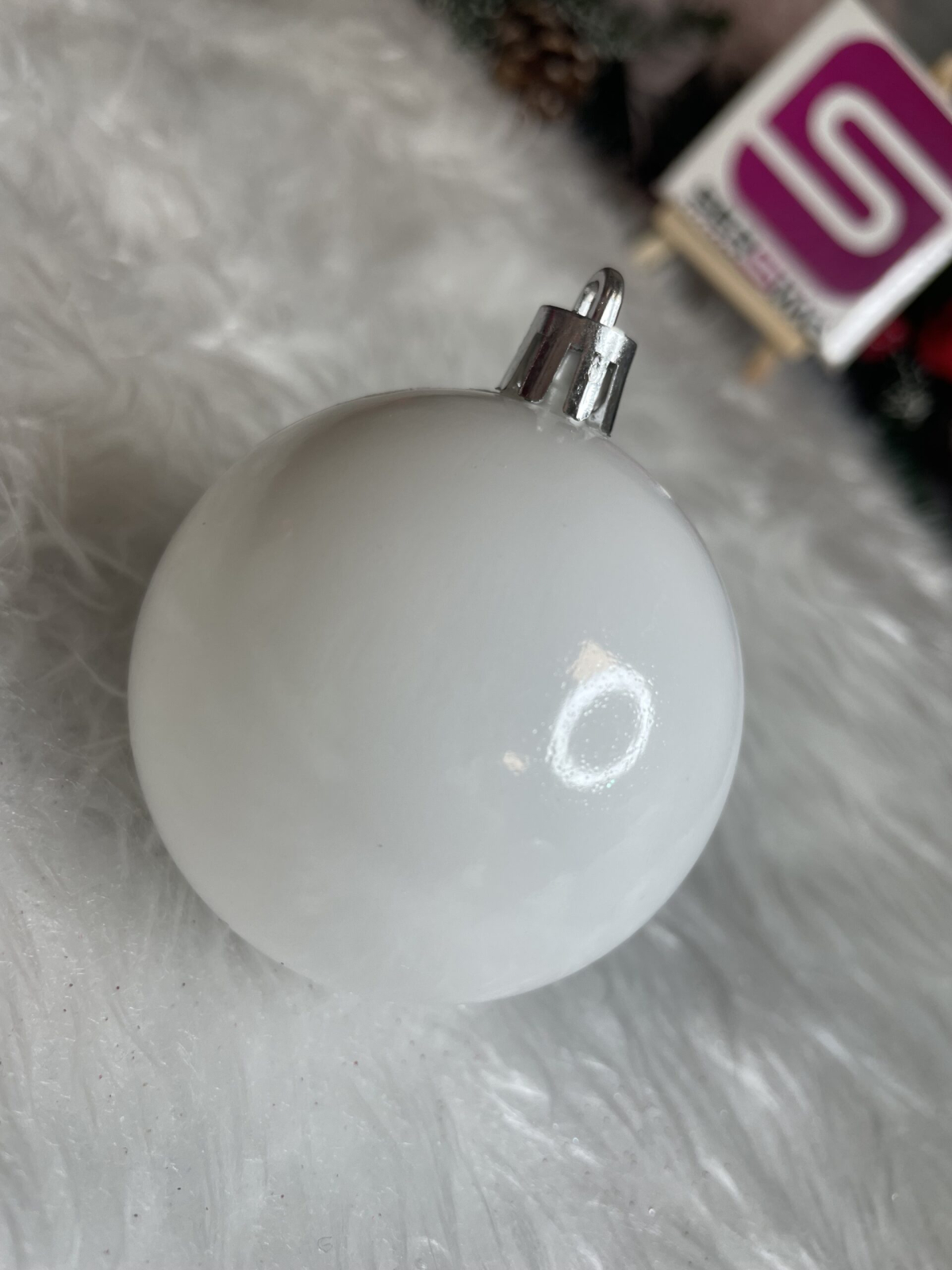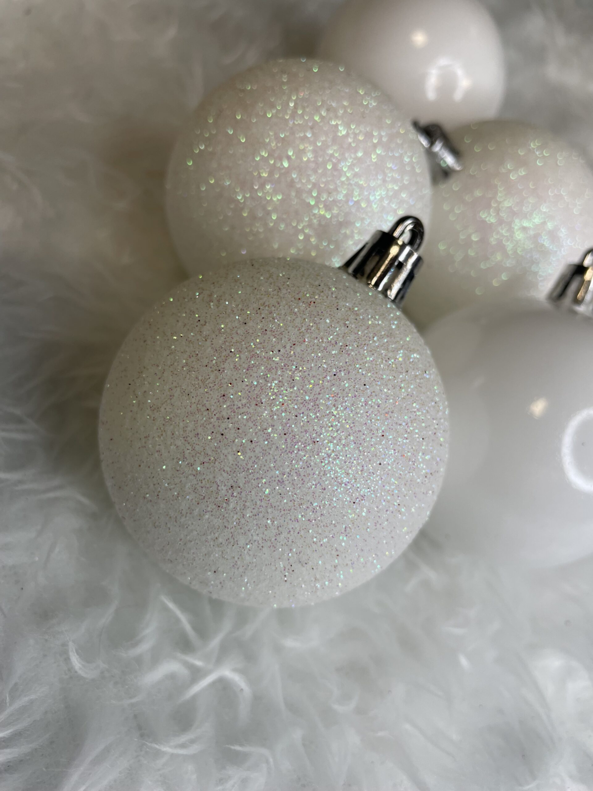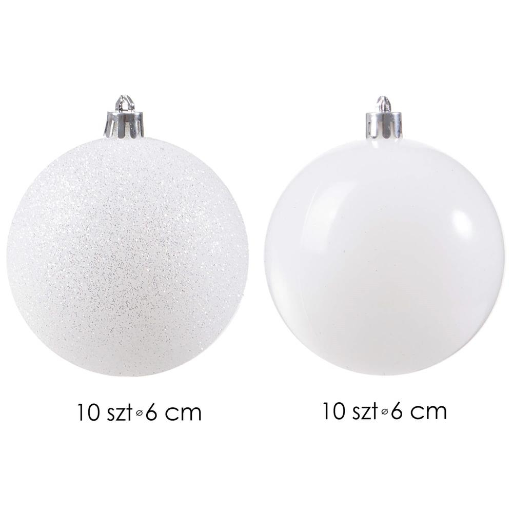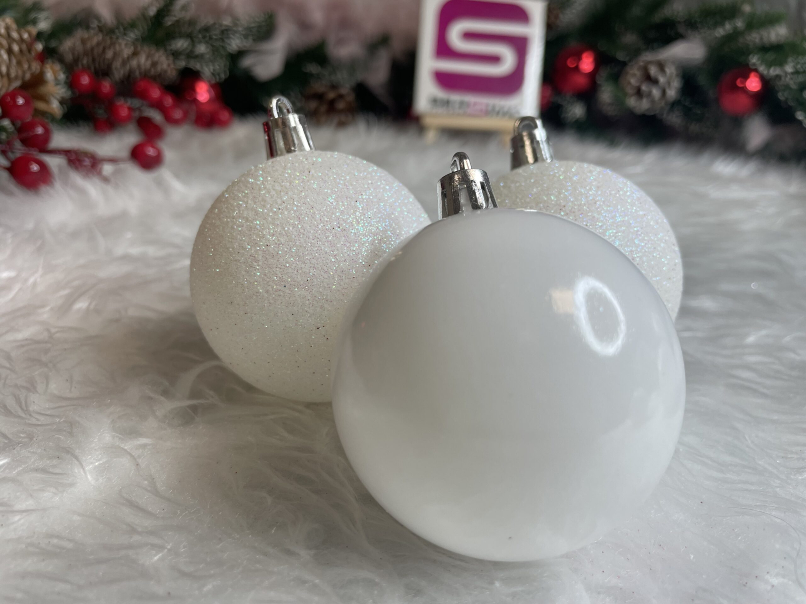Culoare: alb, alb cu sclipici Material: plastic/plastic Dimensiune: 6 cm Cantitate: 20 de bucati de globulete Modele: 2x modele diferite x10 (cu sclipici, cu perle)...