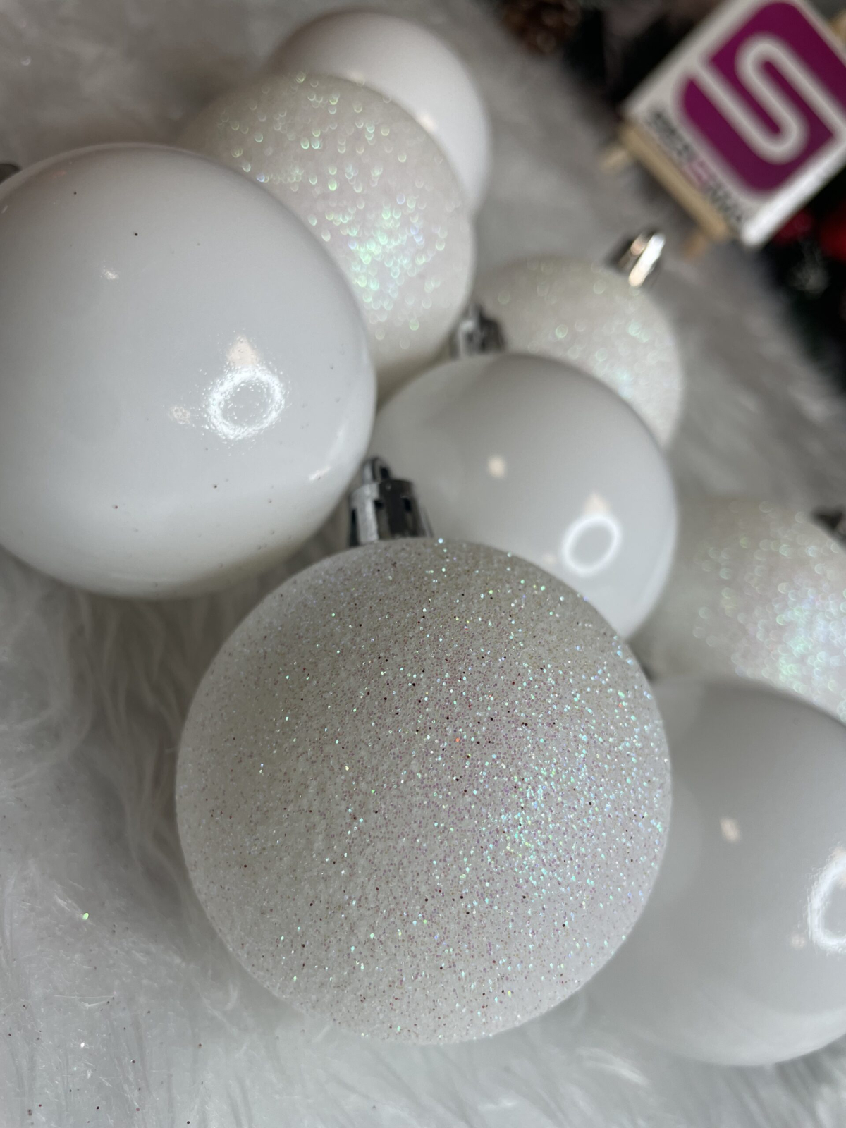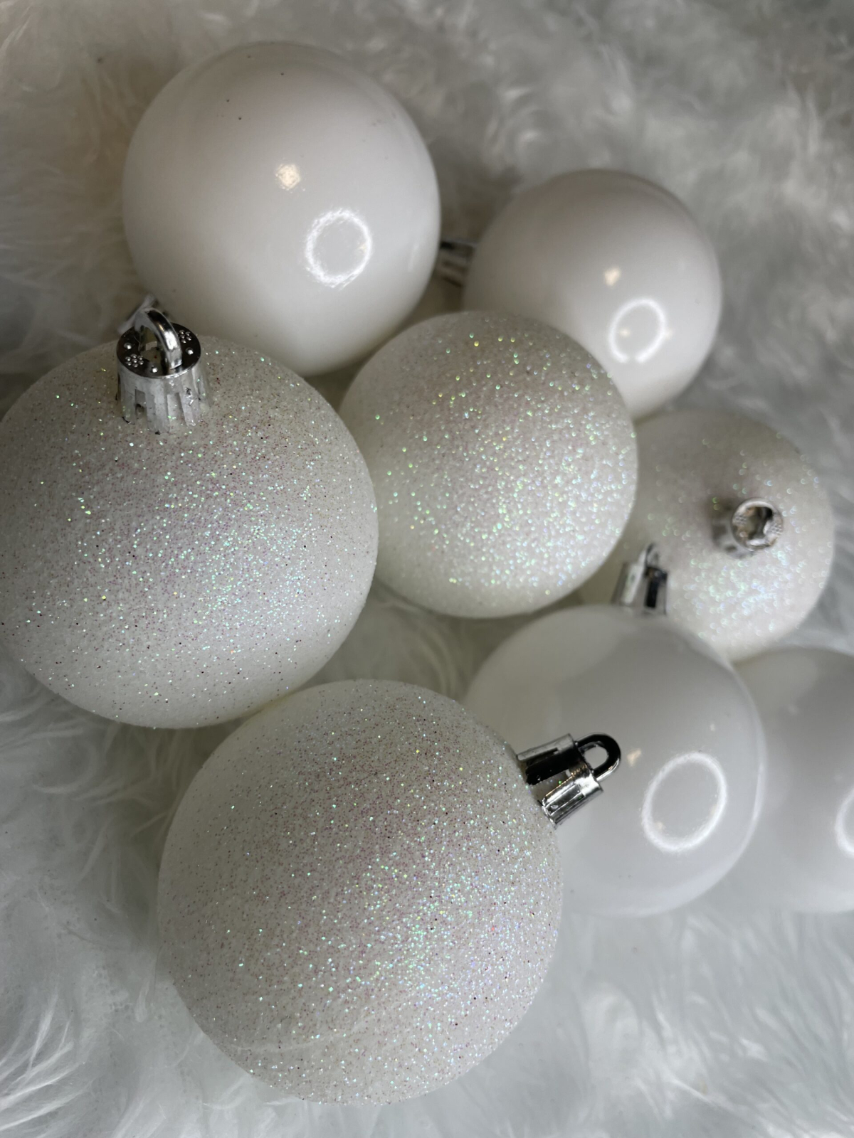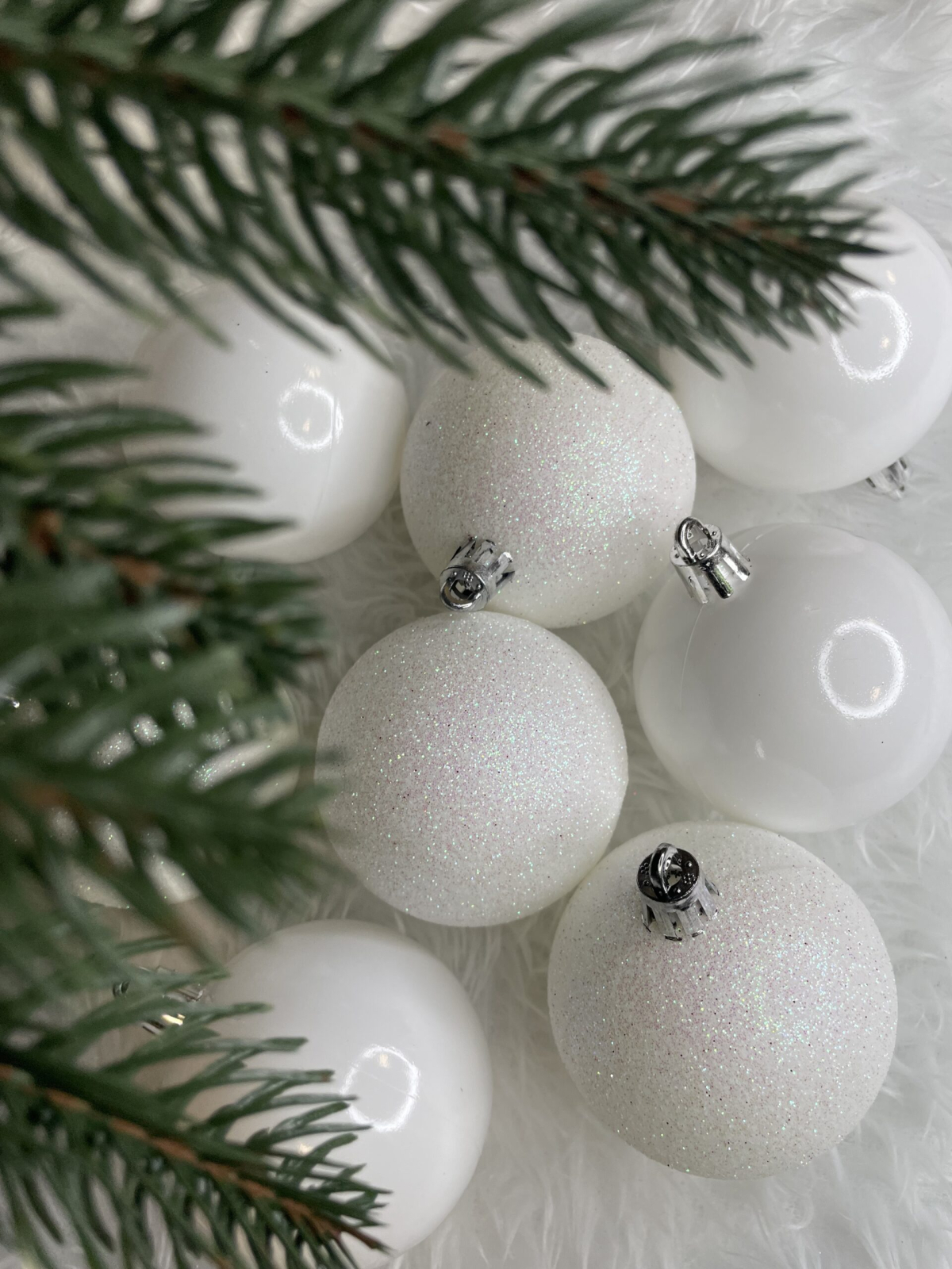 Culoare: alb, alb cu sclipici Material: plastic/plastic Dimensiune: 6 cm Cantitate: 20 de bucati de globulete Modele: 2x modele diferite x10 (cu sclipici, cu perle)...