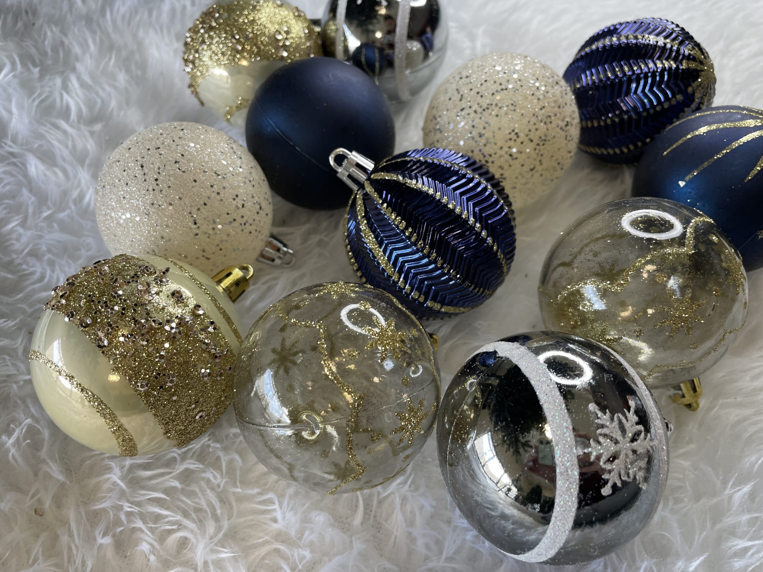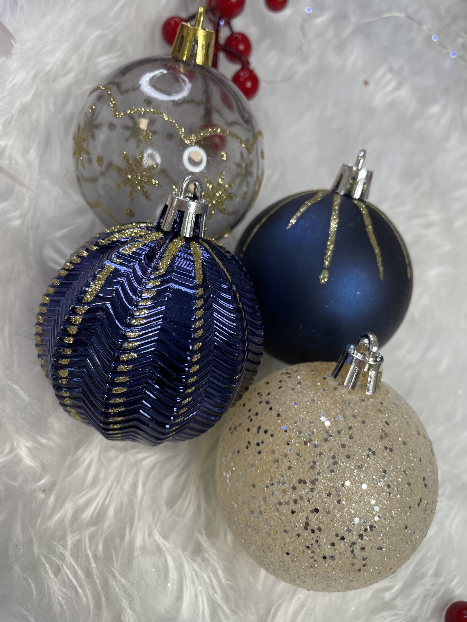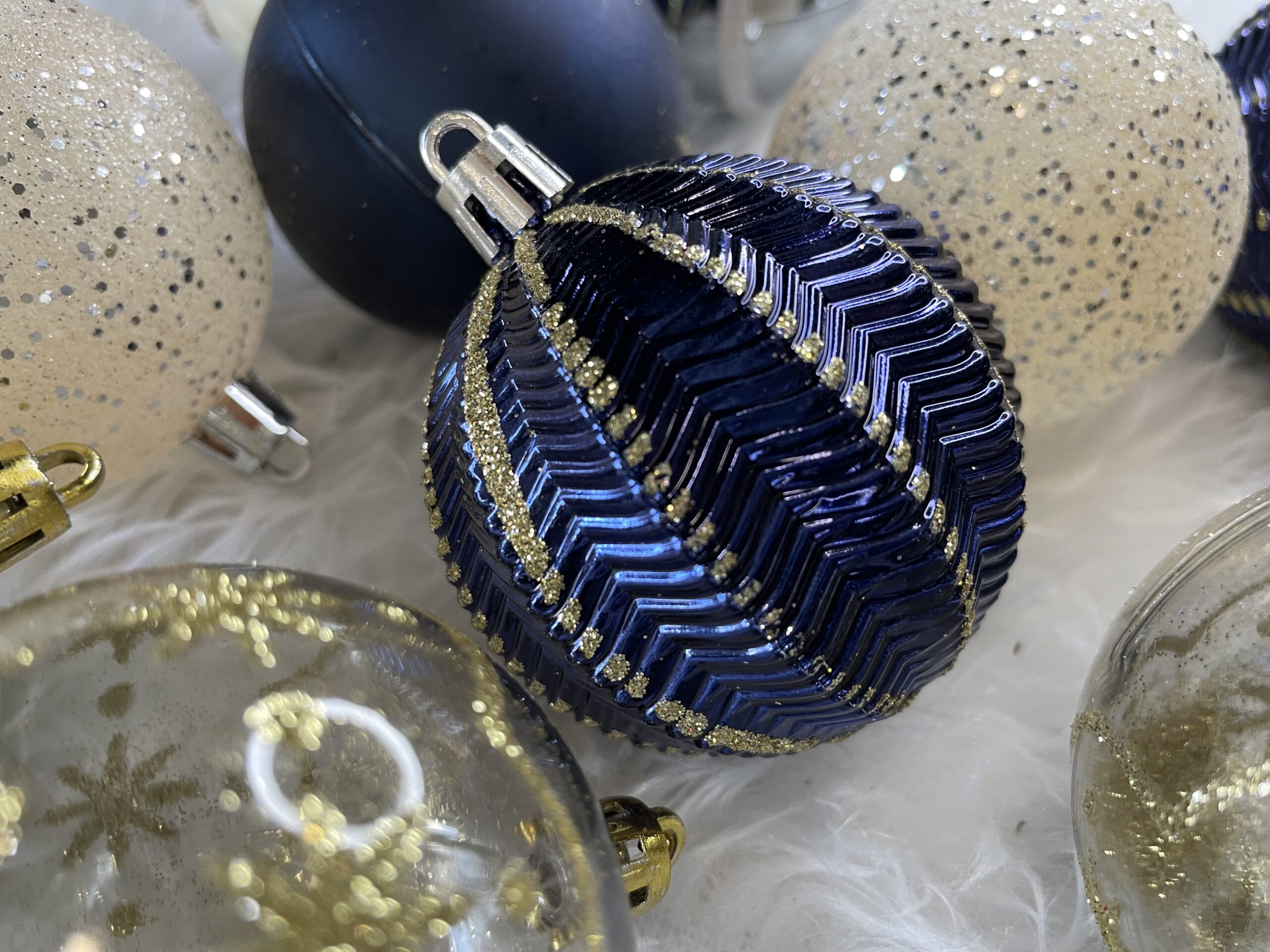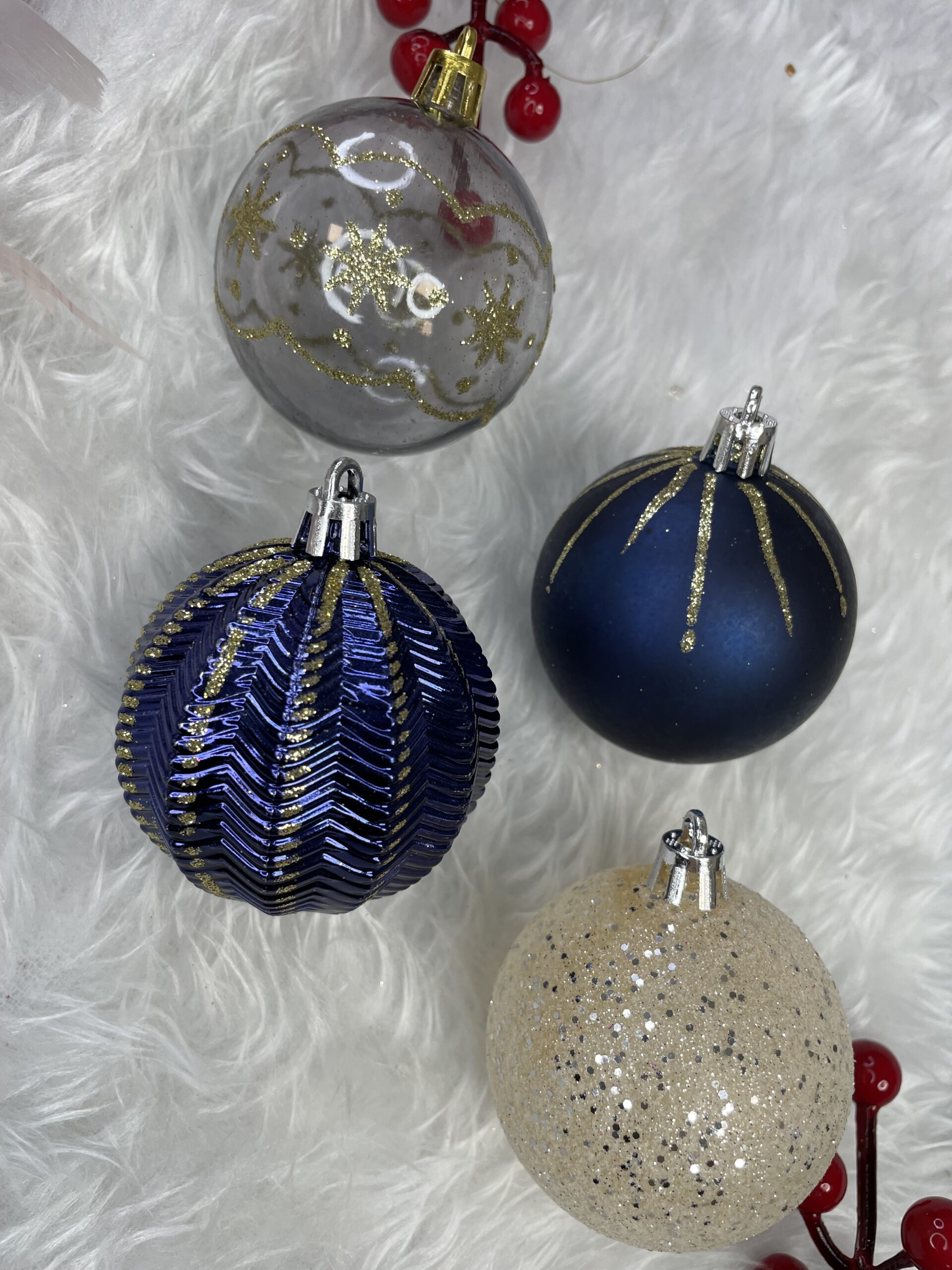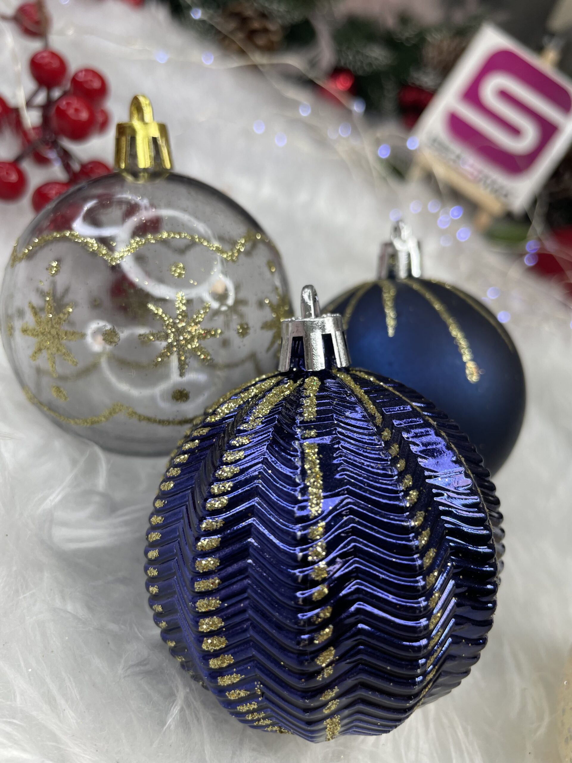 Culoare: albastru marin, auriu, argintiu, alb, argintiu Material: plastic Cantitate: 30 de globulete Modele: mat, sclipici, perlat, transparent, in relief Incasabil, sfori de agatat Craciunul,...