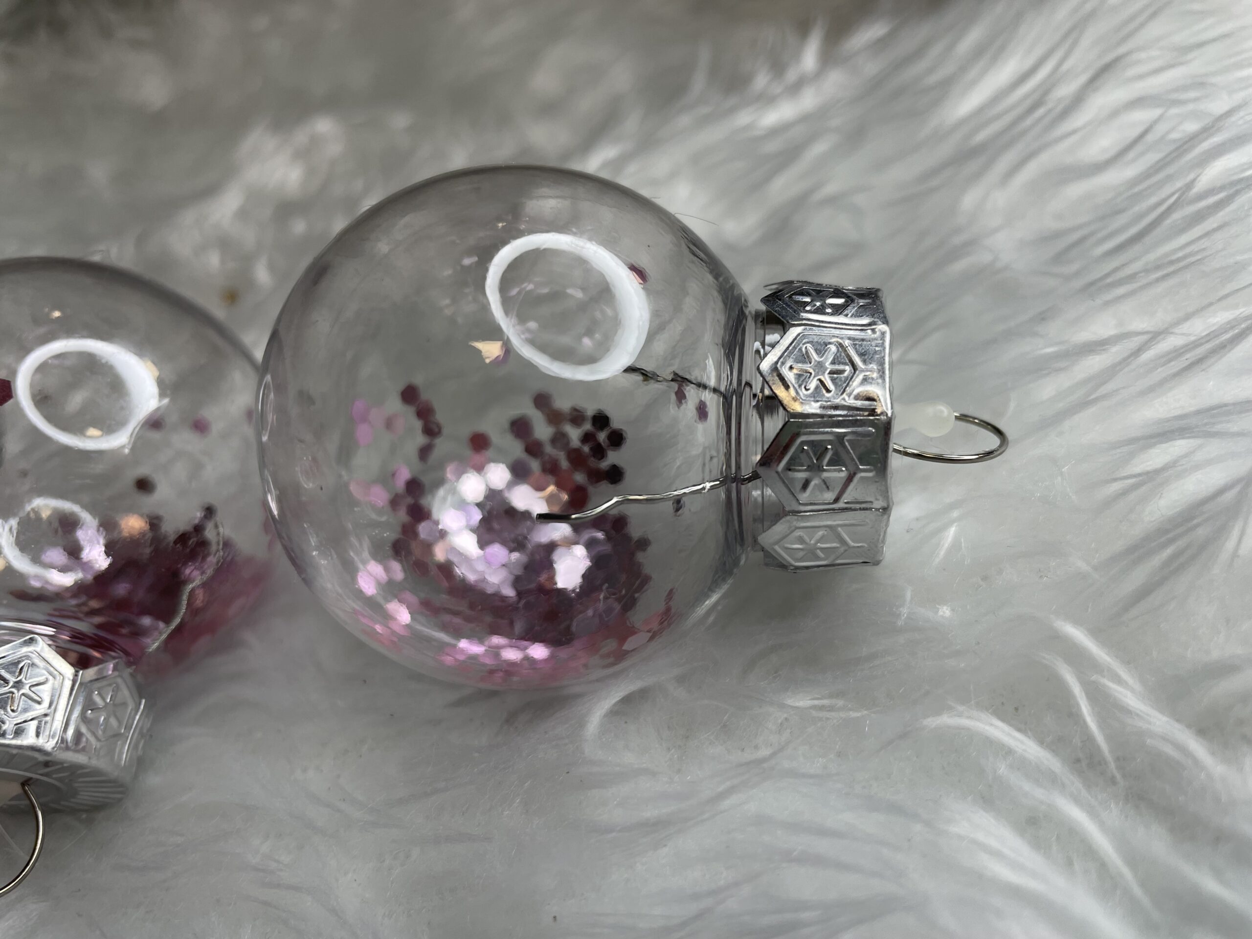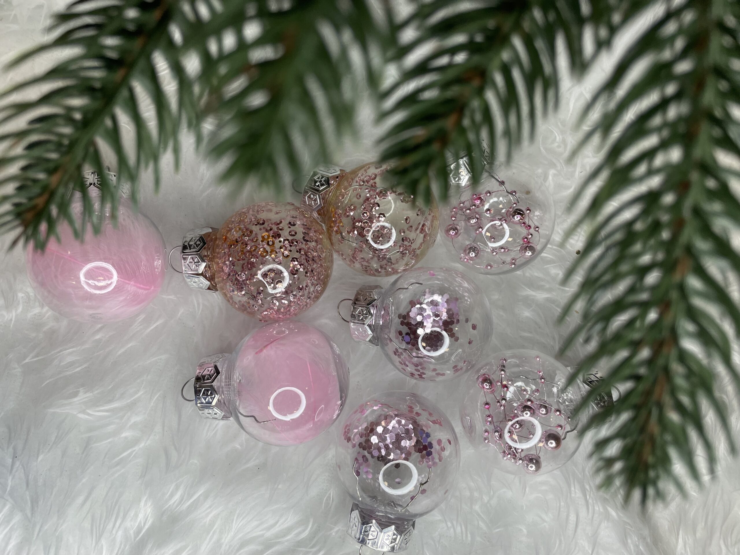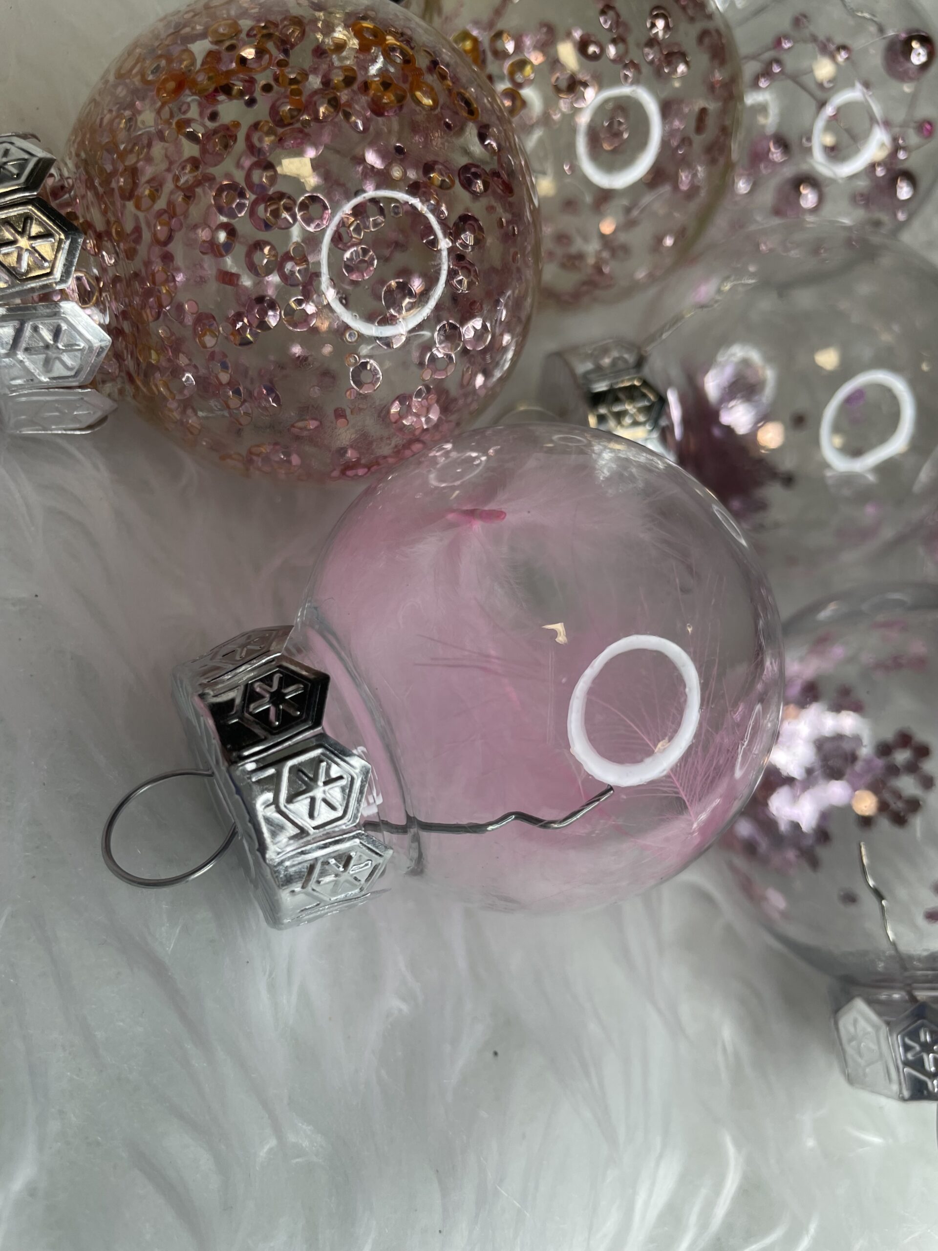 Culoare: transparent cu interior roz Material: plastic Cantitate: 24 bucati de globulete Desene: 1.5 mm: 4 modele diferite Incasabil, snur pentru agatare Setul include: 6x...