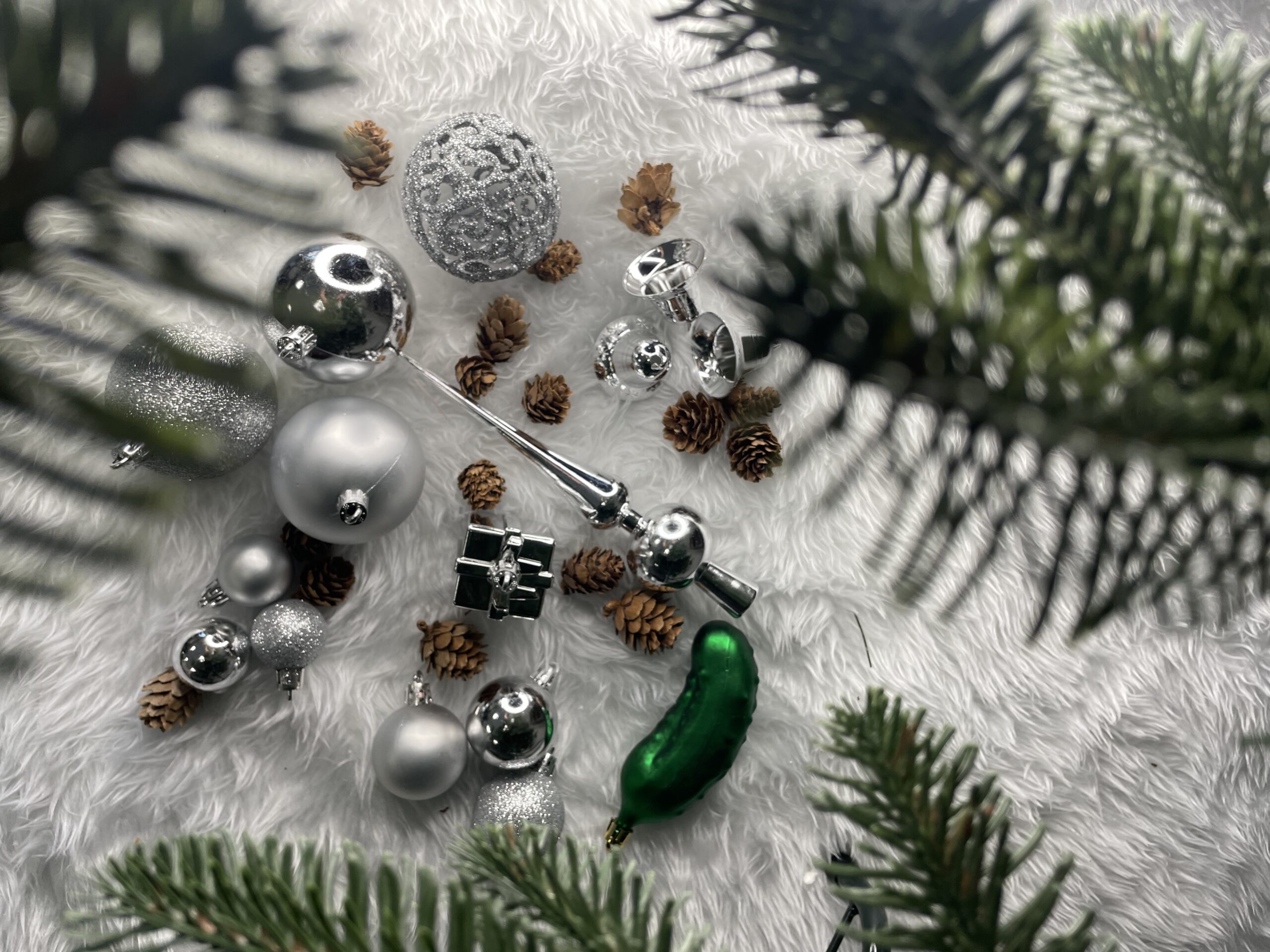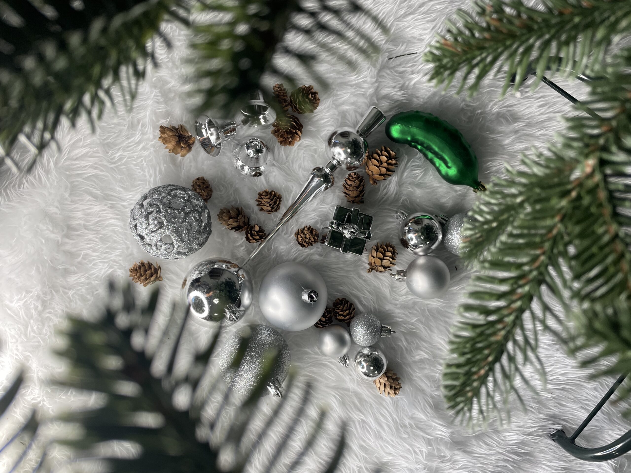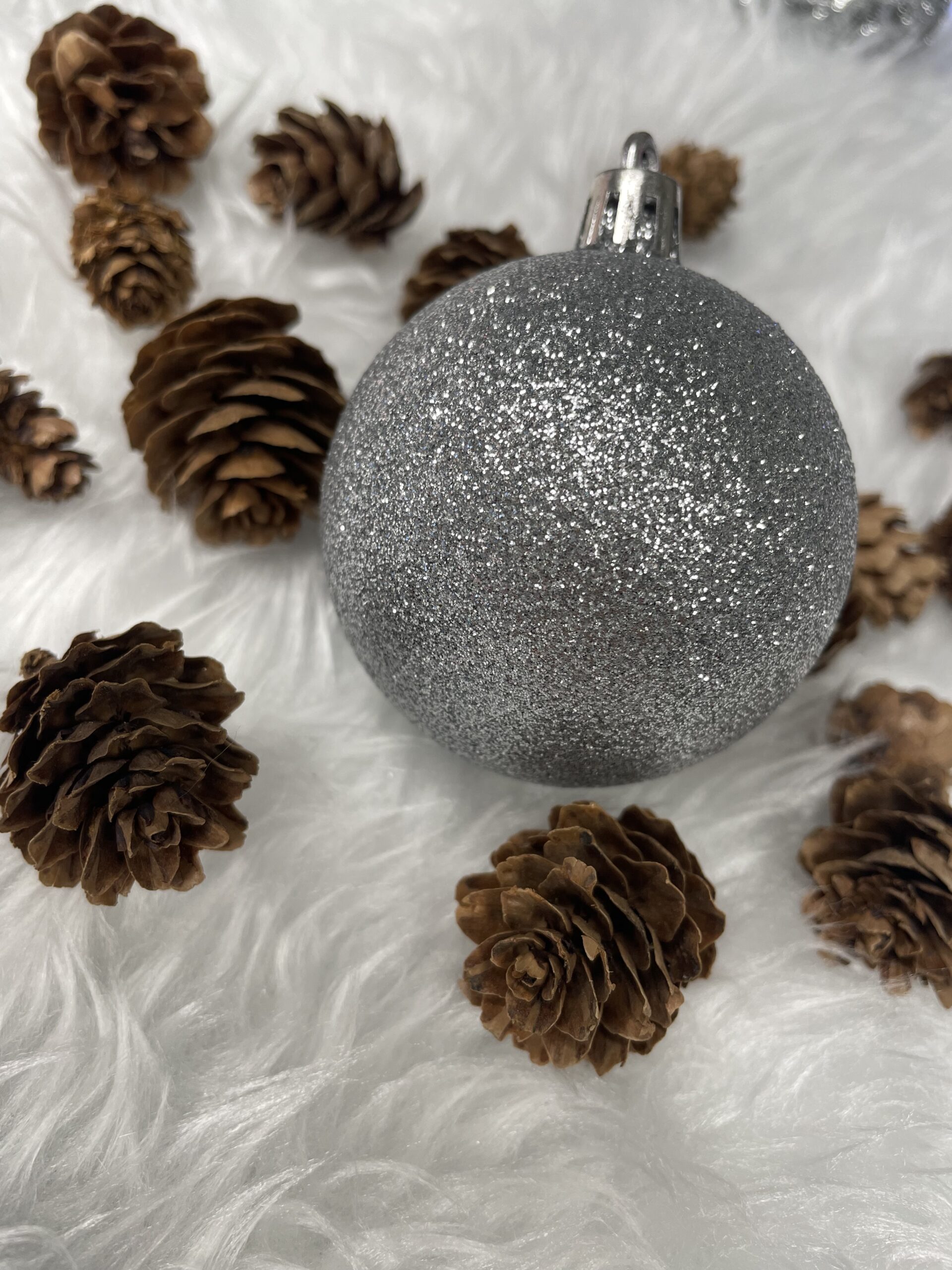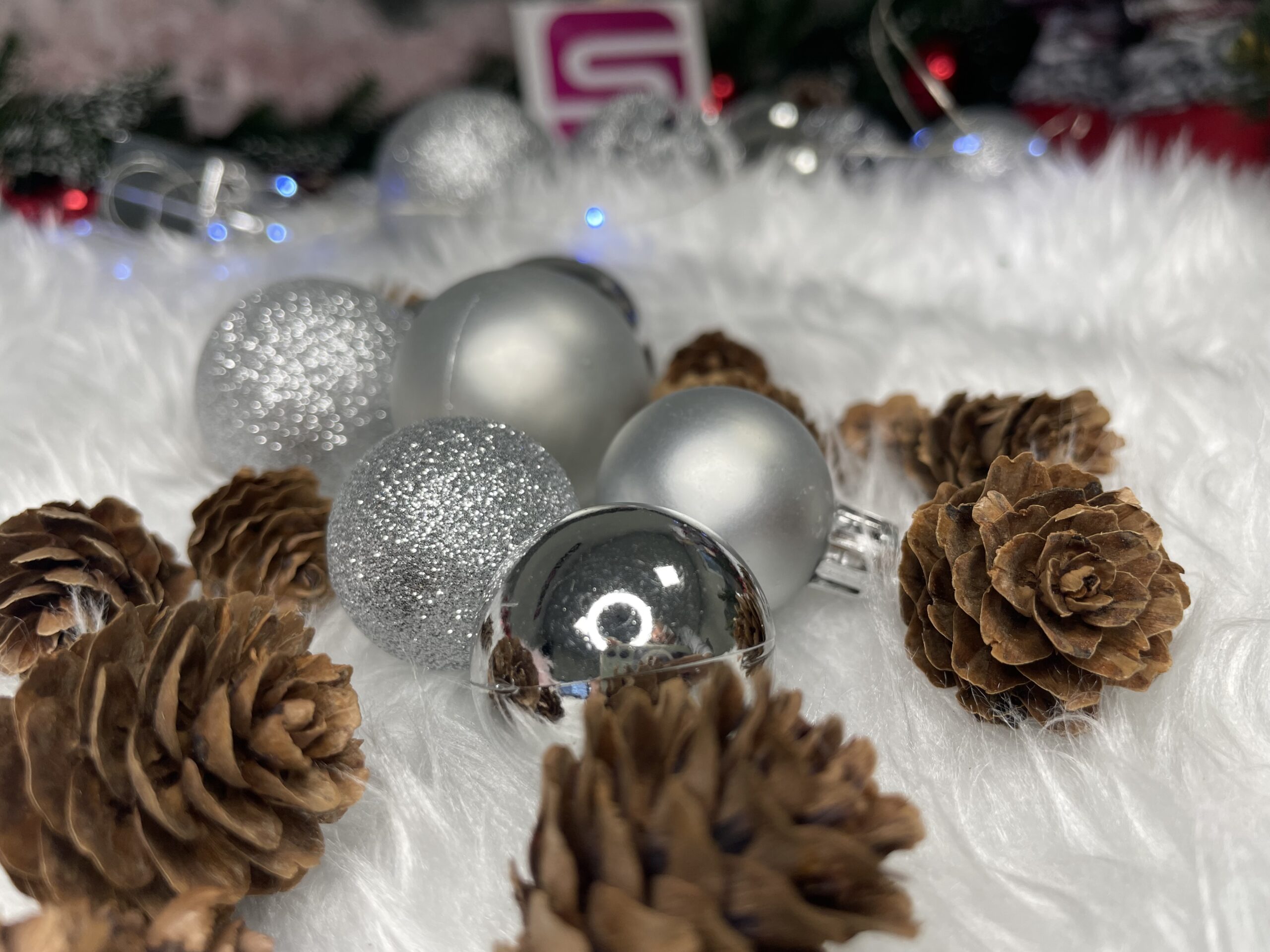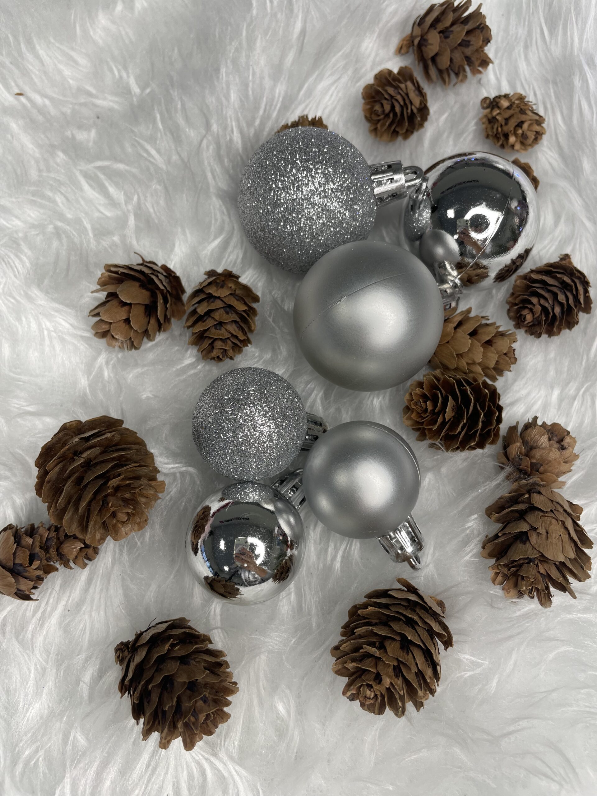 Set globuri si decoratiuni de Craciun, 102 piese, diverse dimensiuni, argintiu