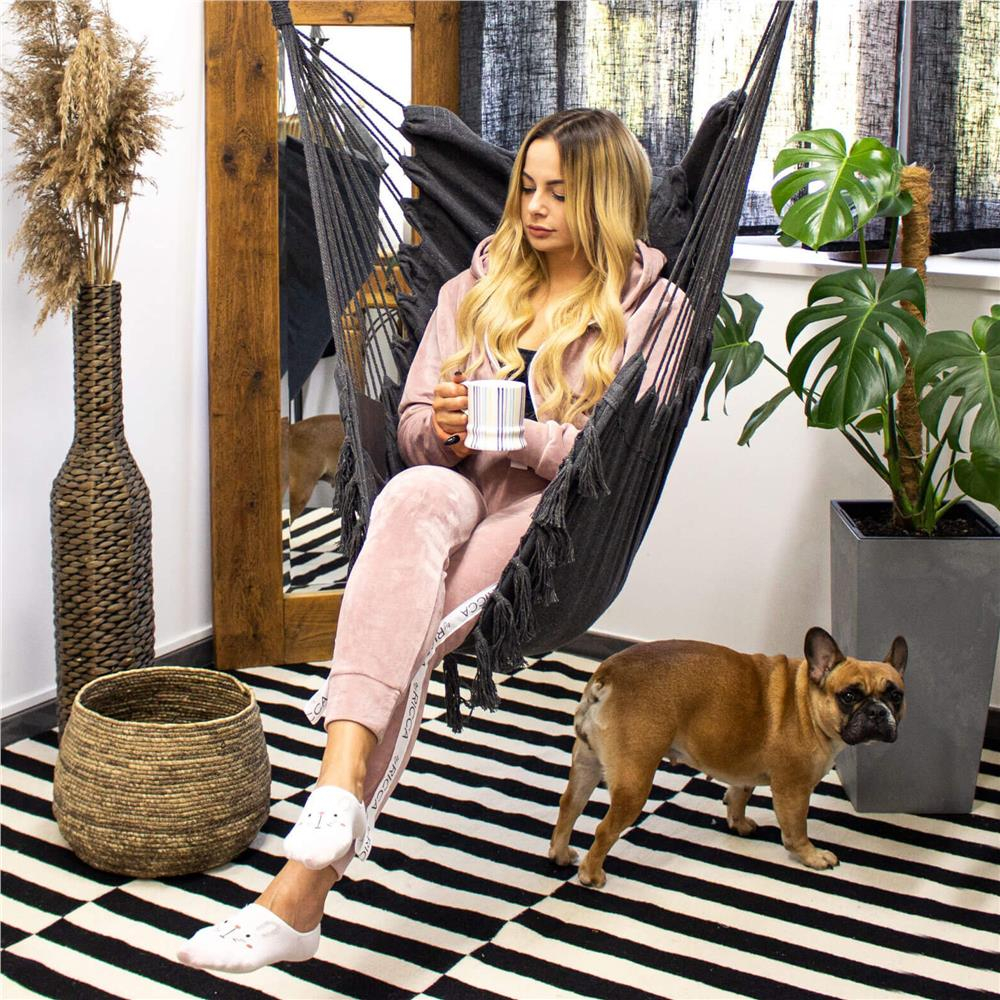 Culoare: gri inchis Material: 65% bumbac + 35% poliester; lemn Sarcina maxima: 150 kg Include 2 perne Include buzunar lateral Fotoliul suspendat se potriveste in majoritatea amenajarilor din gradina, de pe terasa, sau din interiorul casei – in camera de zi sau in camera copiilor. Le va oferi copiilor o joaca sigura si plina de distractie, iar adultilor o relaxare fericita. Acesta are un scaun si un spatar confortabil si moale, realizat din bumbac natural cu o usoara atingere de fibre sintetice. Acest lucru il face nu numai placut la atingere, ci si durabil. Datorita materialelor de cea mai buna calitate, produsul nostru poate rezista la o sarcina de pana la 150 kg, astfel incat persoanele de toate varstele se vor putea bucura de avantajele pe care le ofera produsul nostru!Datorita dimensiunilor sale compacte, scaunul hamac este extrem de usor de transportat si depozitat. Acesta poate fi rulat sau desfacut cu usurinta oriunde doriti sa va relaxati. Este partenerul de calatorie perfect pentru picnicuri, camping sau vacante.Nu trebuie sa va faceti griji cu privire la intretinerea dificila a scaunului hamac. Materialele din care este confectionat sunt rezistente la intemperii (tesatura din poliester si bumbac), ceea ce inseamna ca il puteti lasa afara pentru o perioada lunga de timp fara sa va faceti griji ca se va deteriora. In plus, datorita combinatiei sale de culori, va adauga eleganta si stil ambientului dumneavoastra.