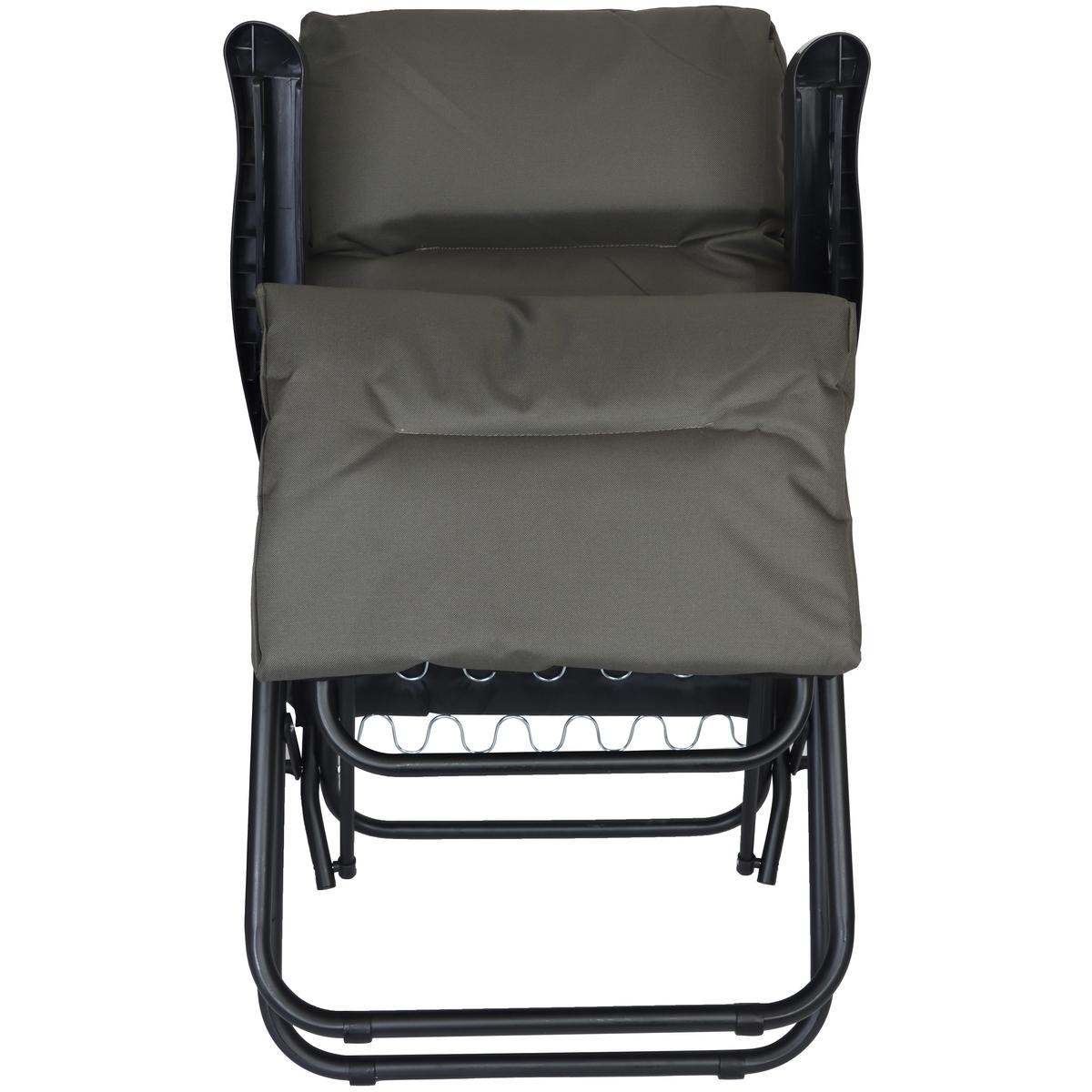 Specificatii tehnice Dimensiuni fotoliu: 106 x 57 x 83 cm (inaltime x latime x adancime) Dimensiune sezut: 47 x 46 cm (latime x adancime) Dimensiune spatar: 64 x 47 cm (inaltime x latime) Inaltime sezut de la sol: 45 cm Material cadru: otel Ø22 mm, grosime 0,8 mm Material sezut: oxford 600D Capacitate maxima: 110 kg Culoare: verde inchis Scurta descriere Relaxeaza-te in gradina sau pe terasa cu un fotoliu confortabil si elegant. Fotoliul pliabil cu taburet incorporat ofera sustinere optima si un plus de confort pentru picioare. Materialele rezistente si constructia solida permit utilizarea zilnica in aer liber. Caracteristici principale Design ergonomic cu suport pentru picioare Material oxford durabil si usor de curatat Constructie pliabila pentru economie de spatiu Cadru metalic stabil si rezistent Greutate redusa pentru transport facil Potrivit pentru terasa, balcon, gradina sau camping Culoare neutra, usor de asortat cu orice decor