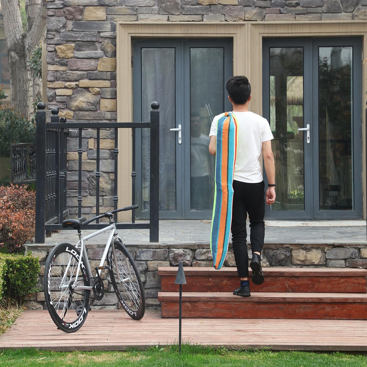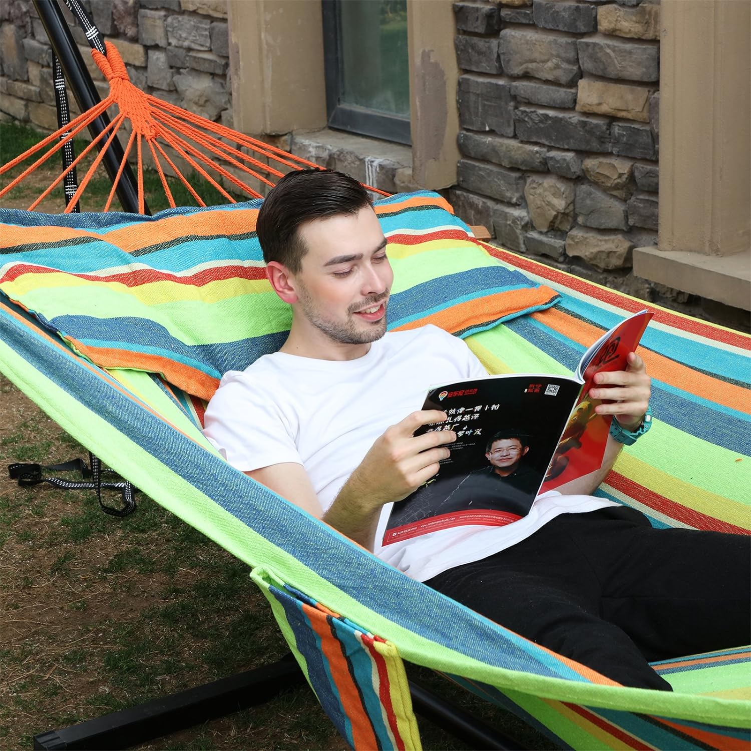 Specificatii: Material: 70% bumbac, 30% poliesterD Densitatea tesaturii: 320 g/㎡ Dimensiunea hamacului: 210 x 150 cm (L x l)T Lungime totala: 300 cm Dimensiunea pernelor: 70 x 40 cm (L x l) Dimensiunea barei de lemn: 120 x 3,2 x 2,2 cm (L x l x i) M Max. capacitate de incarcare: 300 kg Despre acest articol Fabricat din 70% bumbac + 30% poliester, cu densitatea de 380g/㎡, acest hamac de camping este respirabil si absoarbe transpiratia.Cu capetele nodurilor lucrate manual, acest articol este frumos si durabil. Adoptand procesul special de tricotare, franghiile de bumbac pot suporta o distributie uniforma a greutatii, capacitatea portanta poate ajunge la 300 kg, acest articol are o durata lunga de viata.Dimensiune: 210 x 150 cm, acest hamac in aer liber este suficient de lat si de rezistent pentru a se potrivi confortabil cu doua persoane. Il puteti imparti cu persoana iubita pentru un pui de somn la soare. Pernele sunt un plus minunat.Cu elemente usor de montat, acest pat balansoar este potrivit pentru utilizare in interior sau in exterior. Atasat cu o geanta de transport, este convenabil de transportat. Este destul de usor de curatat si poate fi spalat manual la 30 ℃ fara decolorare.