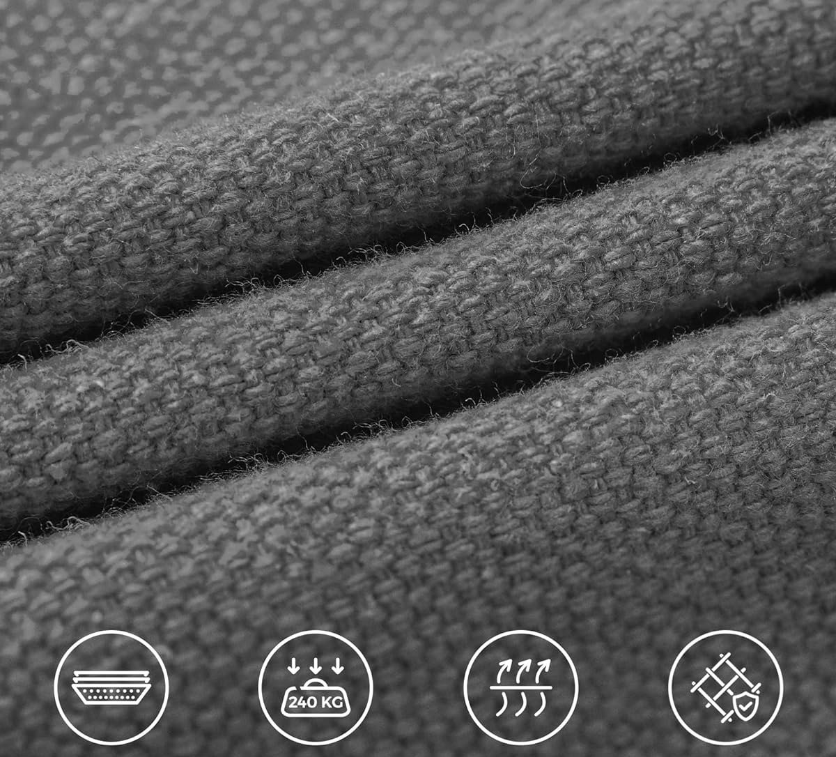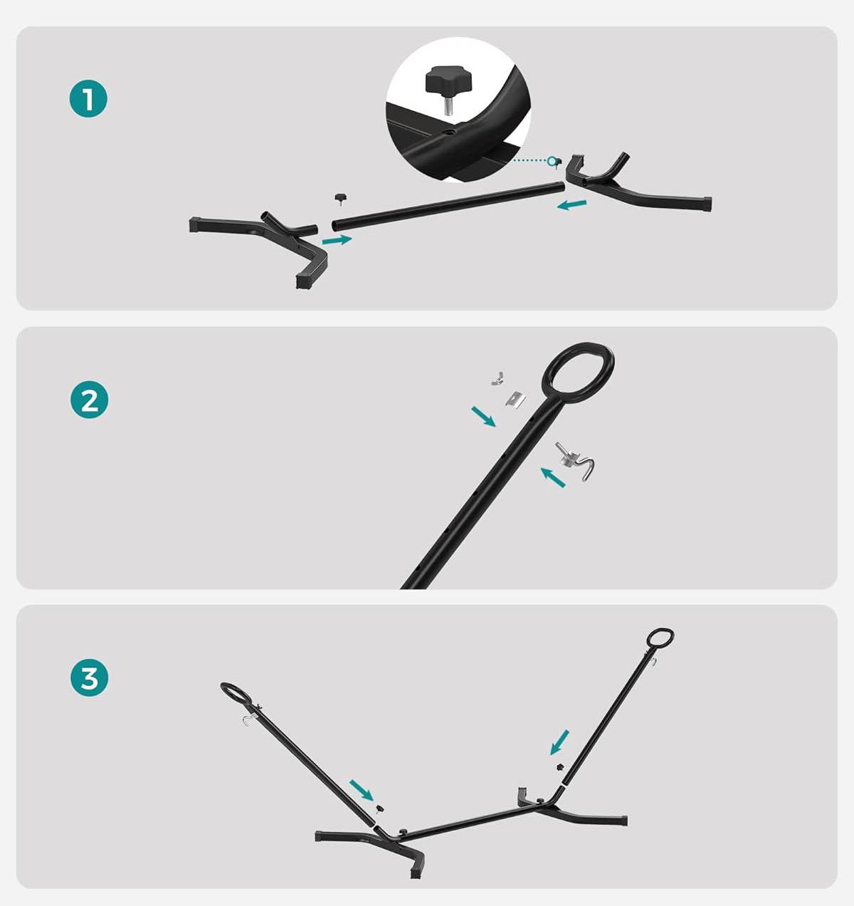Detalii despre produs: Culoare: Cadru negru, hamac gri Material: Metal, bumbac, poliester Dimensiunea cadrului: 300 x 90 x 95 cm (L x l x i) Dimensiunea hamacului: 210 x 150 cm (L x l) Max. Capacitate de incarcare statica: 240 kg Despre acest articol Siguranta si stabilitate: Suportul triunghiular tridimensional este format din picioare de extensie pe ambele parti in partea de jos si o bara laterala, care asigura mai multa stabilitate. Capacitatea maxima de incarcare este de 240 kg - suficient spatiu pentru a va relaxa!Respirabil si confortabil: Hamacul este fabricat din tesatura rezistenta la rupere de 380 g/m², care este durabila, respirabila si confortabila si va infasoara corpul in mod stabil, astfel incat sa va puteti relaxa in el.Usor de asamblat: Datorita constructiei simple, leaganul suspendat poate fi montat in cateva minute, fara unelte.Exista 5 gauri pe fiecare parte a barei de sustinere, astfel incat puteti regla inaltimea hamacului dupa cum doriti.  Puteti folosi acest hamac cu suport in propria gradina sau il puteti da jos si il puteti lua singur pentru camping.