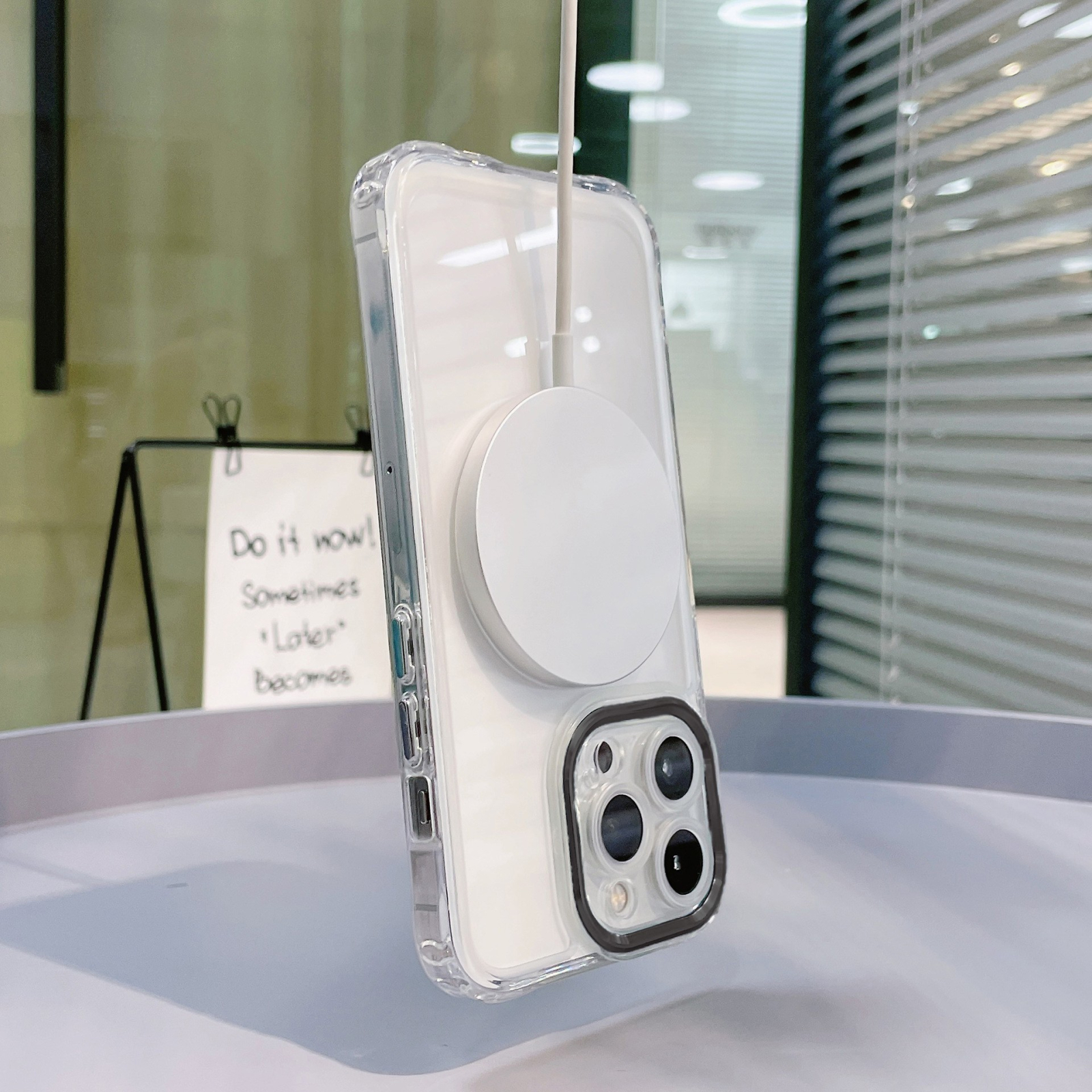 Cand vine momentul incarcarii, lasa iPhone-ul in husa si cupleaza incarcatorul MagSafe sau aseaza-le pe un incarcator certificat Qi.