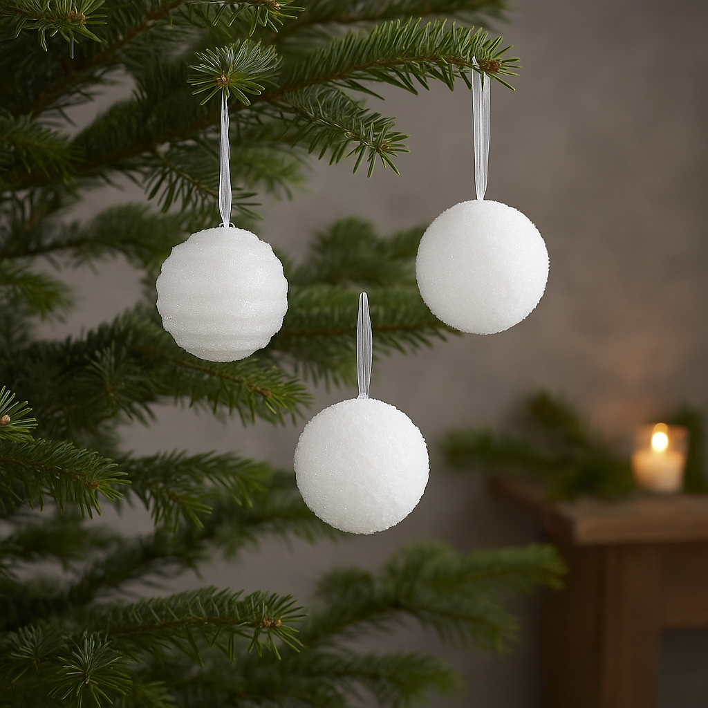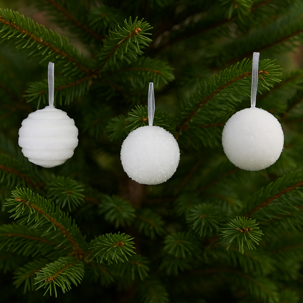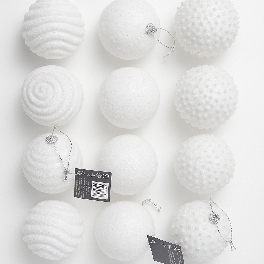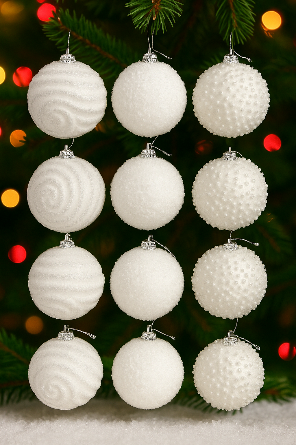 Set 12 globuri Craciun cu sclipici, 3 modele diferite, polistiren, diametru 8 cm, alb
