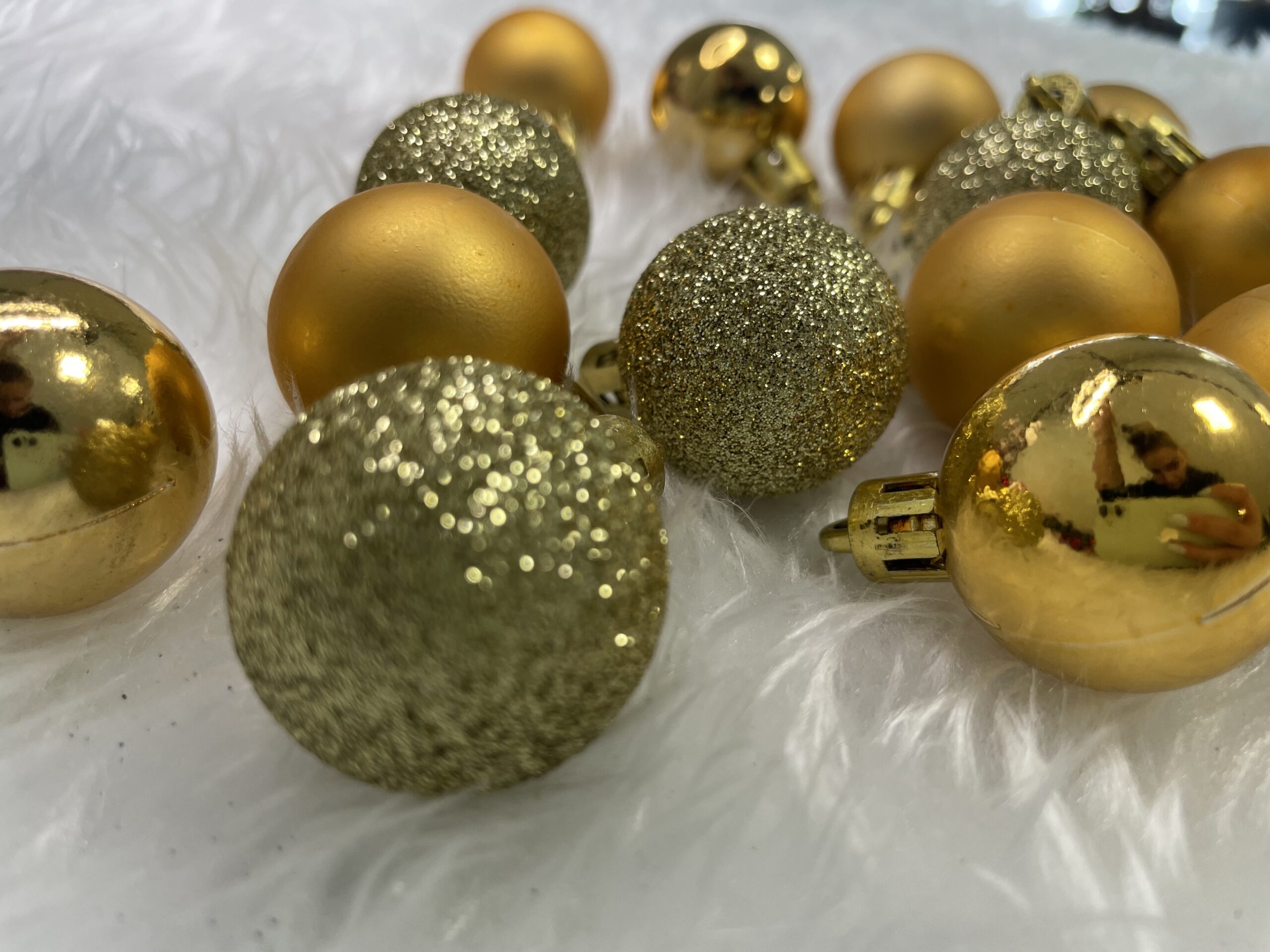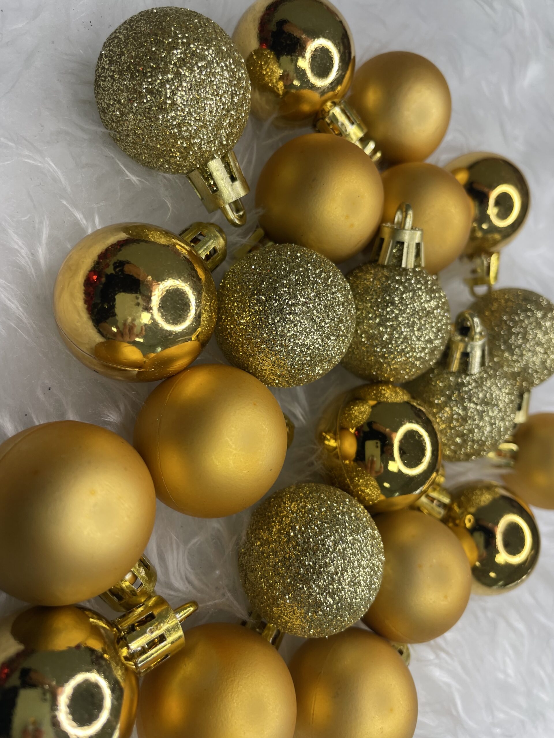 Culoare: auriu Material: plastic Dimensiune: 3 cm Cantitate: 30 bucati de globulete Modele: mat, sclipici, stralucitor Incasabil, sfori aurii pentru agatat Craciunul, ca si intreaga...