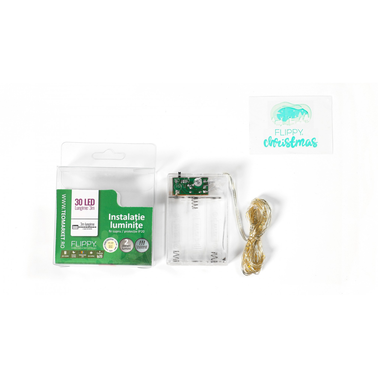 | Continut pachet | 1 X Instalatie de Craciun cu Baterii Tip Liniar, 2 jocuri de lumini, Fir Cupru 3 m 30 LED -uri, Alb Cald |
