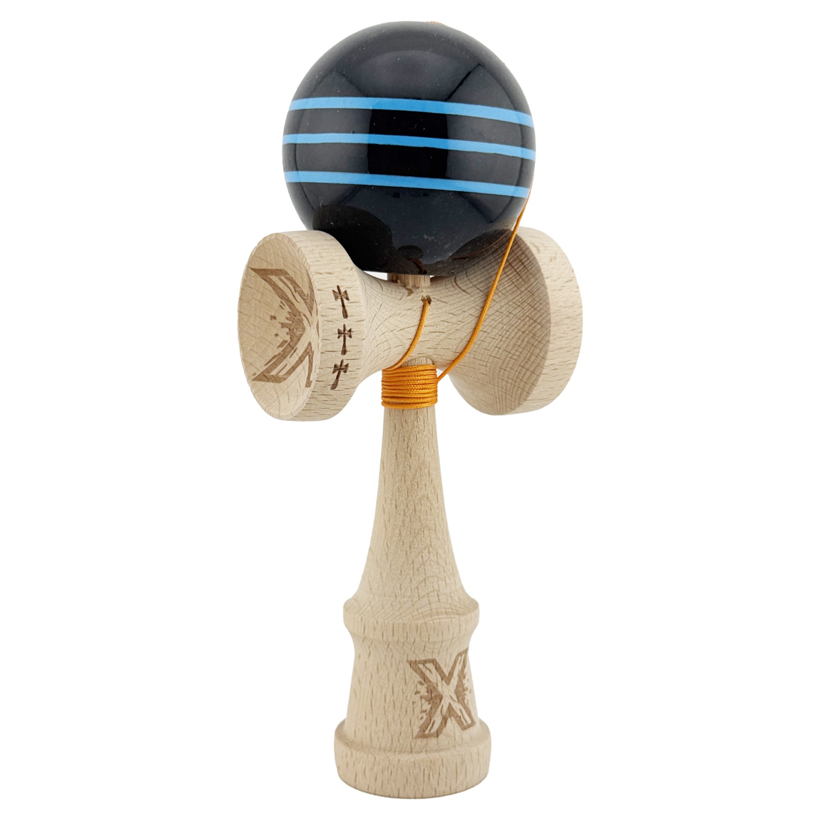 Kendama X Originala, Profesionala, , Big Cups V2, Super Sticky Legendary Cupe Mari, Rulment Metalic cu Ata 55 cm, Negru/Linii Albastre deschise