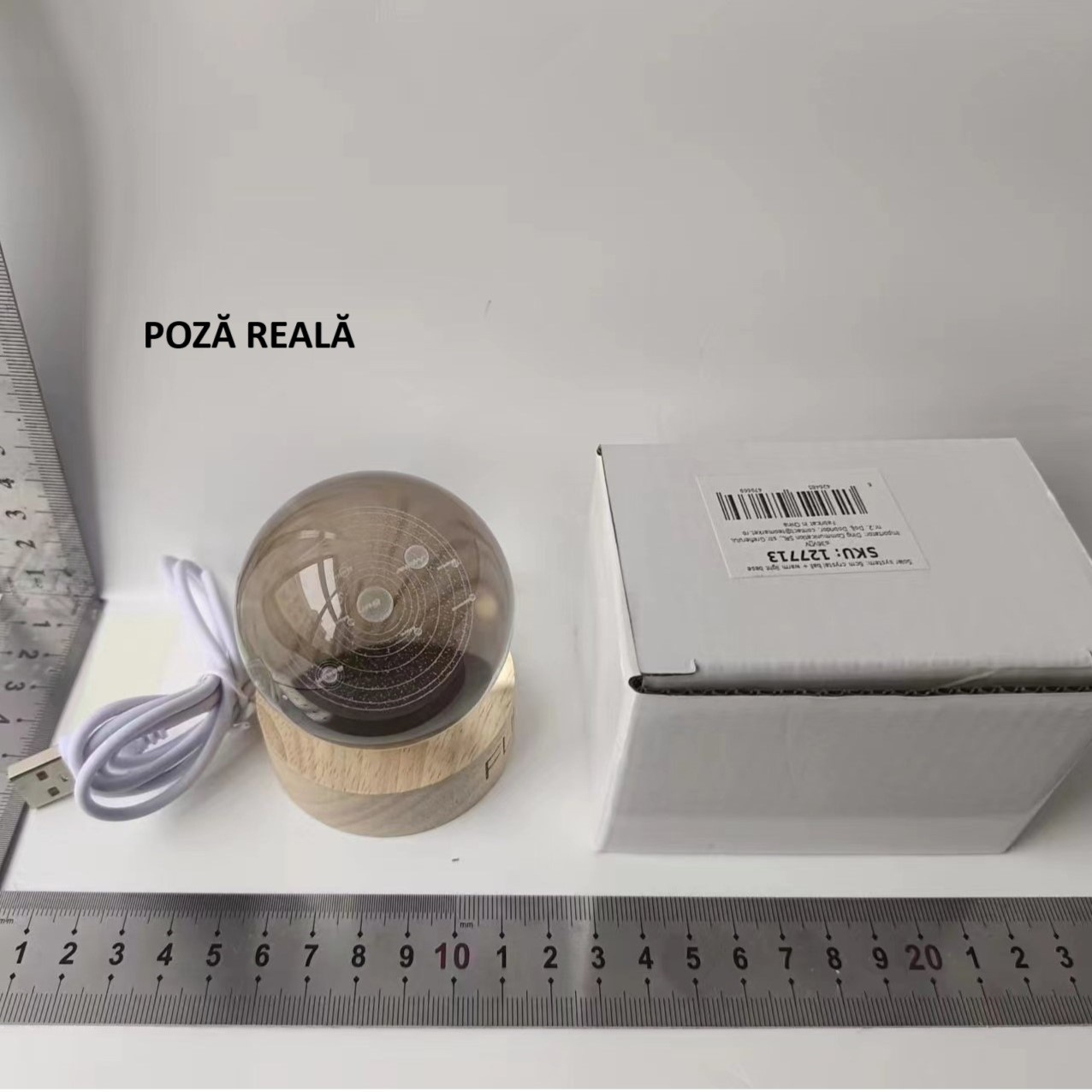 Lampa LED Decorativa, , cu Bila de Cristal cu Diametru 6cm, Model Sistemul Solar 3D, Alimentare USB, Suport din Lemn, Lumina Alb Cald