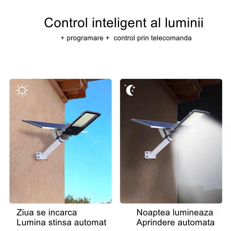 Funcศionare inteligentฤ: Lampa dispune de un senzor de luminฤ încorporat, care detecteazฤ nivelul de luminฤ ambientalฤ ศi ajusteazฤ automat intensitatea luminii în funcศie de nevoi. Aceastฤ caracteristicฤ asigurฤ economia de energie ศi o funcศionare autonomฤ optimizatฤ. De asemenea, lampa emite o luminฤ rece, oferind o iluminare clarฤ ศi vizibilฤ în jurul curศii sau pe stradฤ.