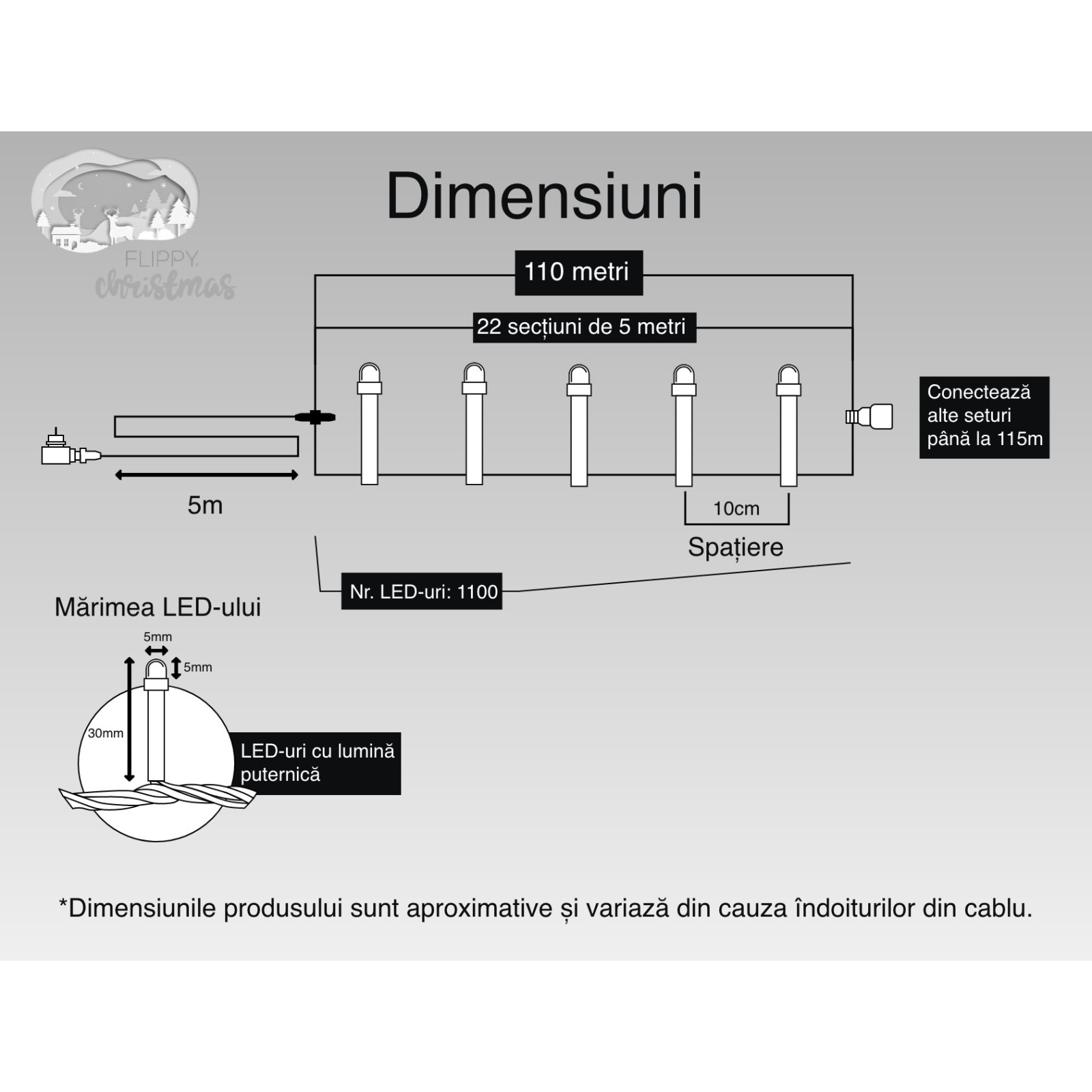 Instalatie Craciun, 110 m, 1100 Led-uri ,Liniara, Albastru, 8 jocuri de lumini, Transformator, Interconectabila, Prelungitor 5 m inclus, Fir Transparent,