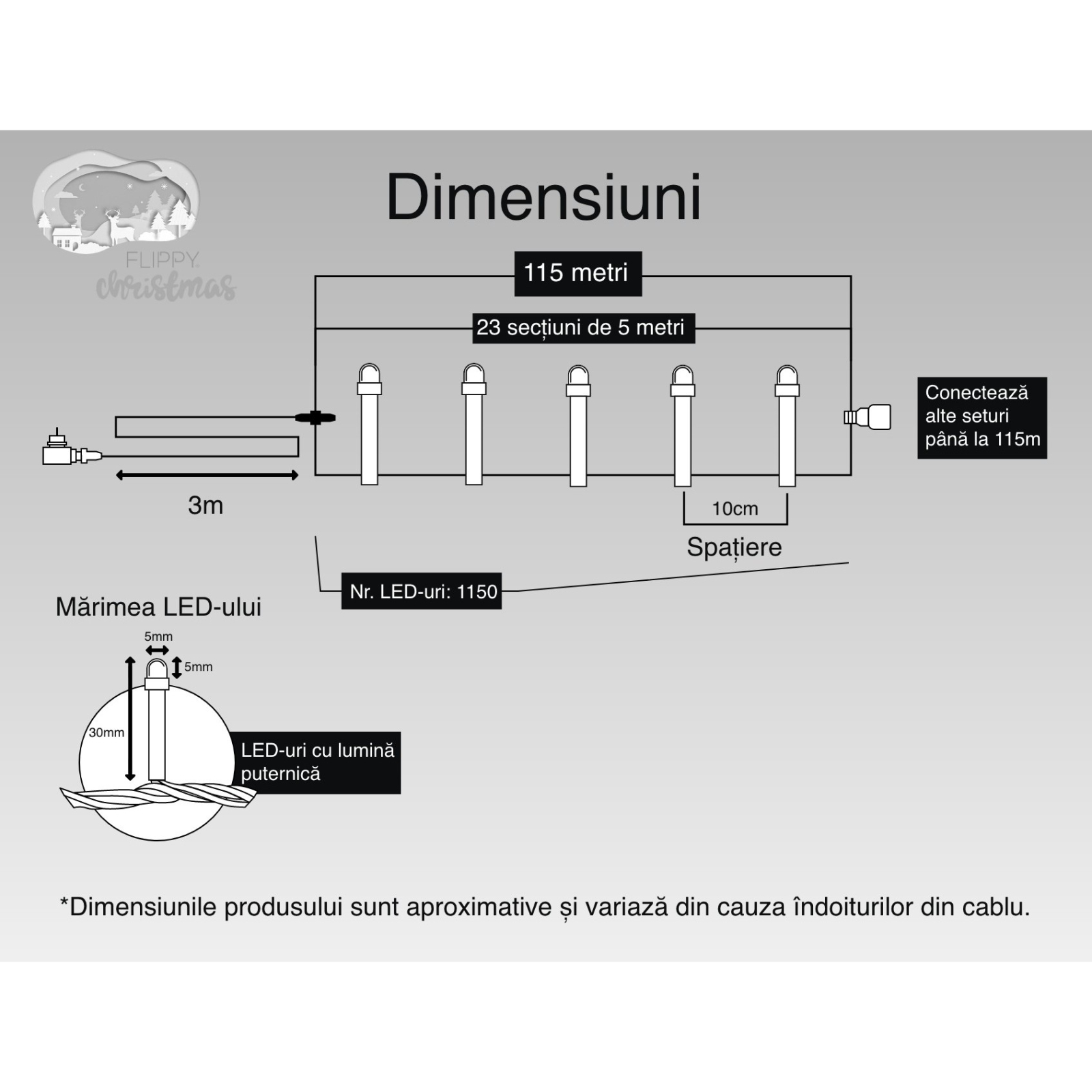Instalatie Craciun, 115 m, 1150 Led-uri ,Liniara, Albastru, 8 jocuri de lumini, Transformator cu telecomanda, Interconectabila, Prelungitor 3 m inclus, Fir Verde,