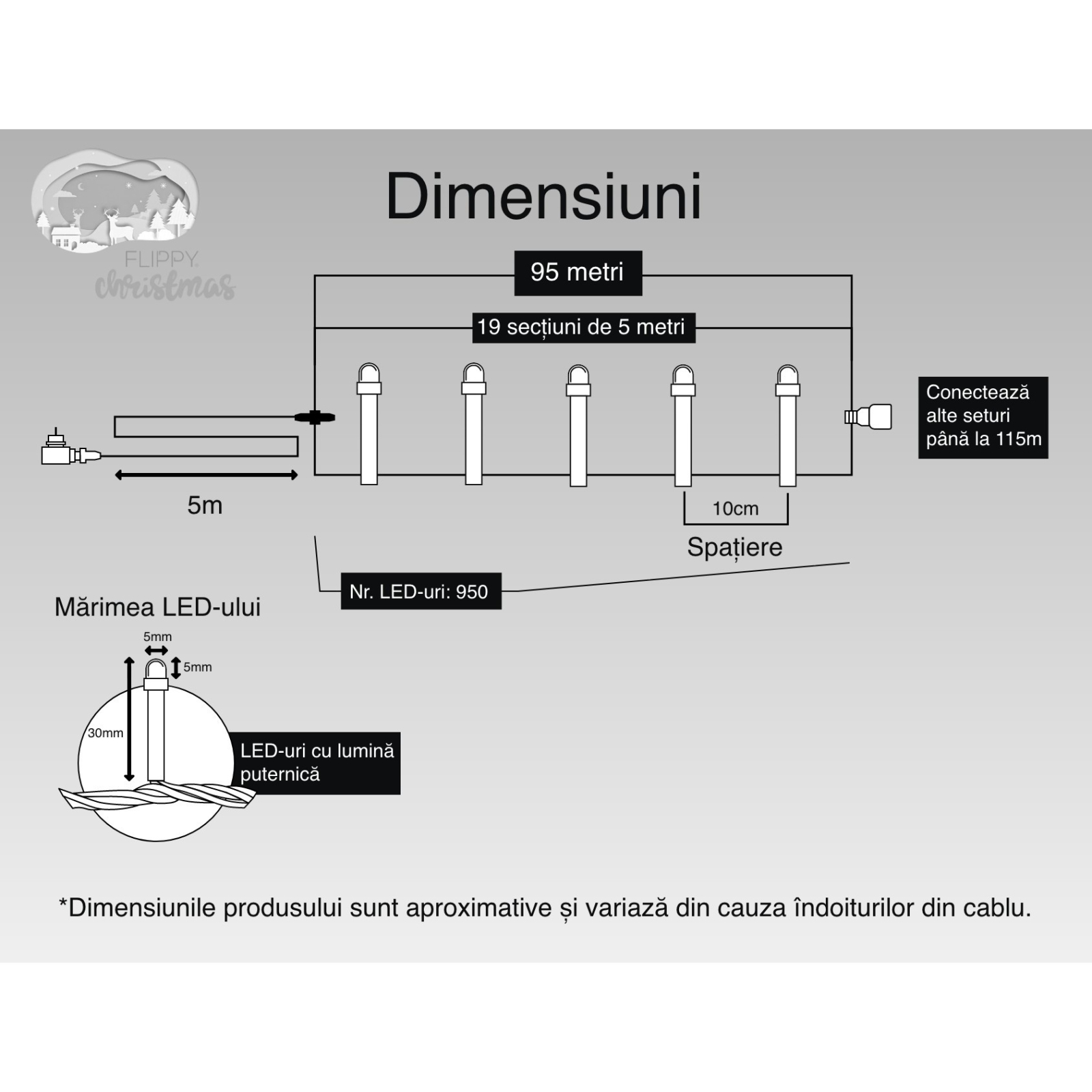 Instalatie Craciun, 95 m, 950 Led-uri ,Liniara, Rosu/Albastru/Rosu/Verde, Flash, Transformator cu telecomanda, Interconectabila, Prelungitor 5 m inclus, Fir Verde,