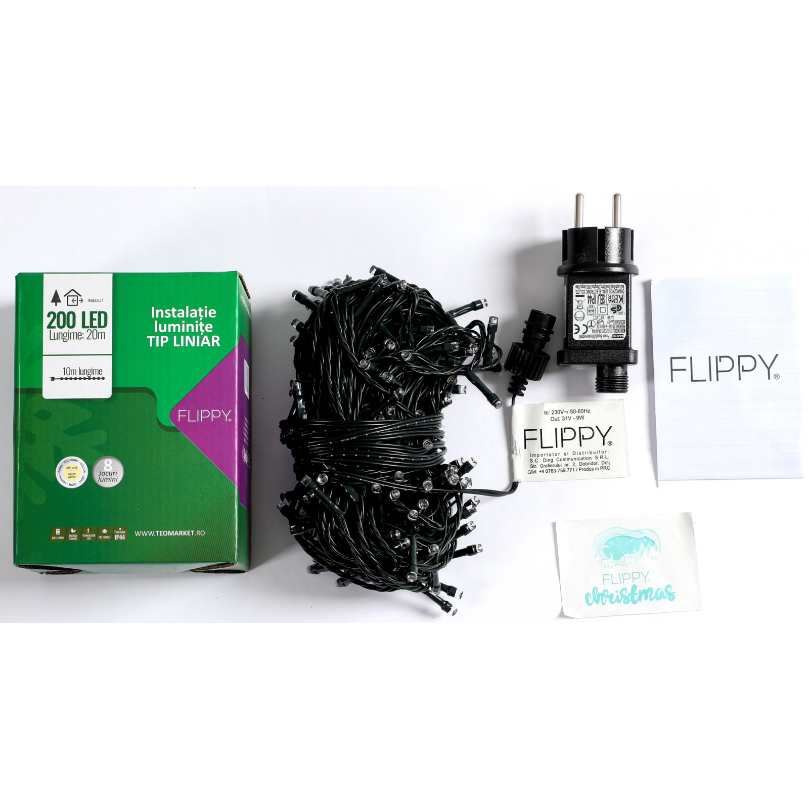 Instalatia are 200 de LED-uri si o lungime de 20 m, este rezistenta la apa avand certificat IP44, ceea ce o face potrivita atat pentru interior cat si pentru exterior.