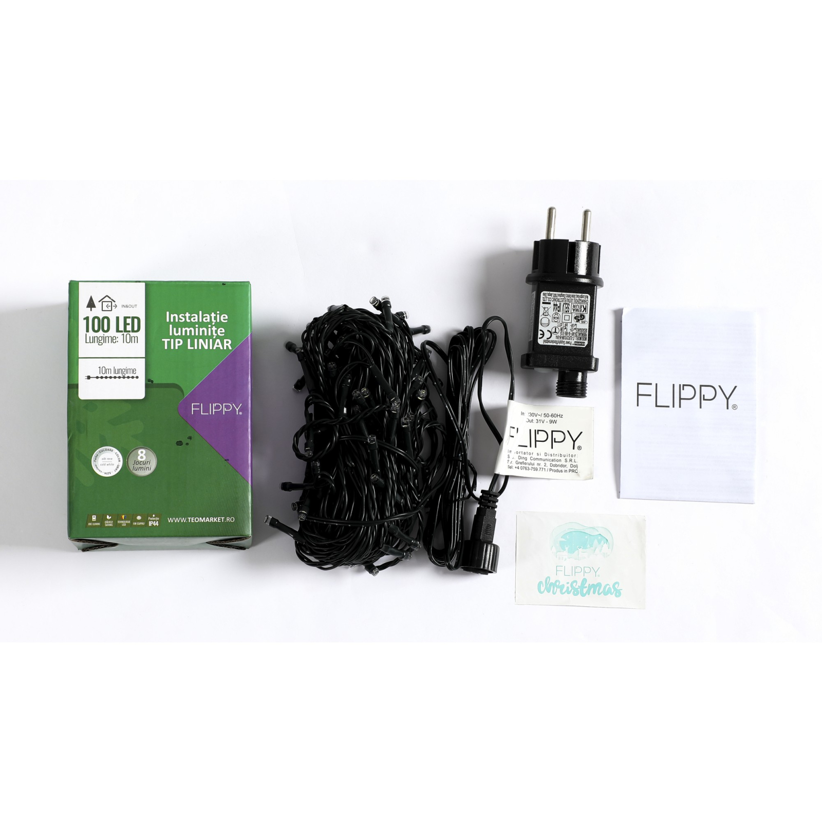 Instalatie Craciun liniara, cu transformator 31V, 10m, Alb Rece, 100 LED-uri V5, 8 jocuri de lumini, Fir verde,