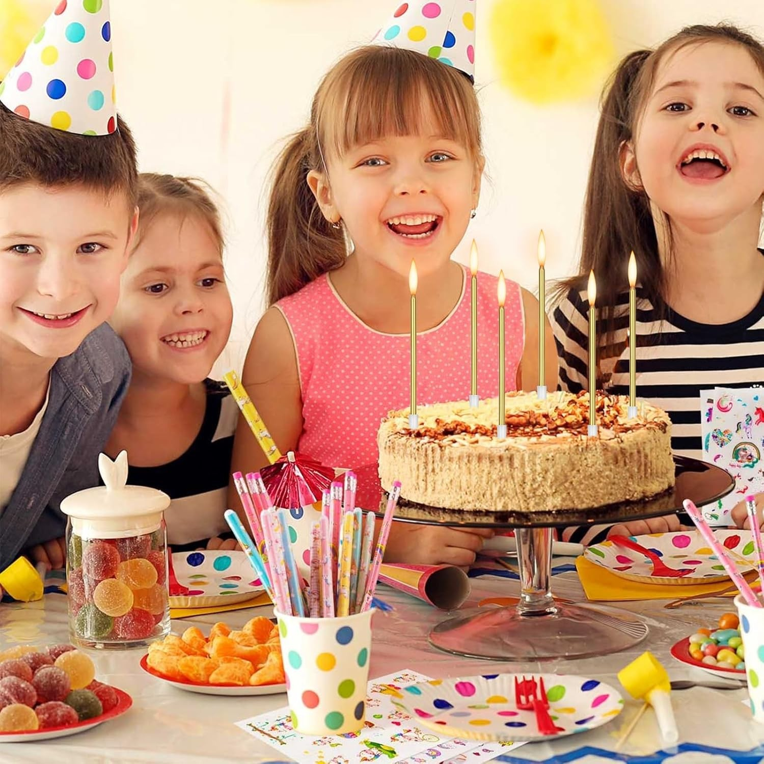 Setul de 6 lumânări tip creion pentru tort este alegerea ideală pentru a adăuga un efect lucios și elegant oricărei aniversări.