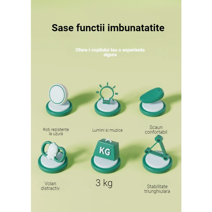 Designul volanului asigura o aderenta confortabila pentru manutele celor mici iar scaunul profilat corespunzator creste confortul si siguranta in timpul plimbarii.
