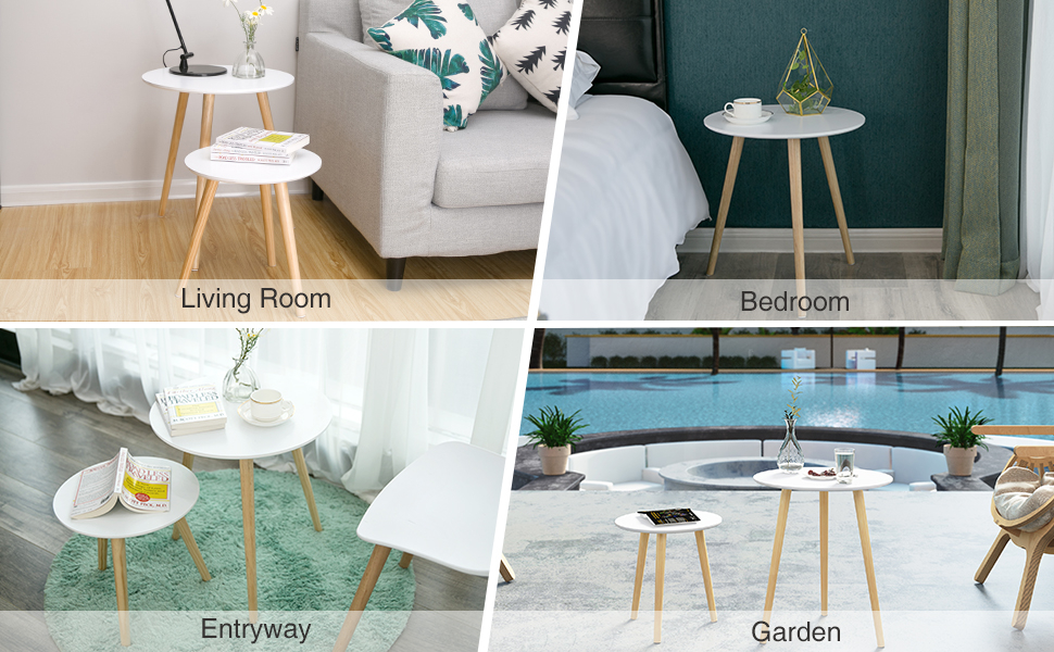 Detalii despre produs:  Culoare: alb/natural.  Material: lemn de pin, MDF (panou de fibre cu densitate medie).  Dimensiunea mesei mari: 45 x 50 cm (diametru x inaltime).  Dimensiunea mesei mici: 35 x 35 cm (diametru x inaltime).  Greutate: 1,95 kg (masa mare); 1,4 kg (masa mica).  Max. Capacitate de incarcare statica per masa: 25 kg. Despre acest articol Masa scandinava simpla - un amestec de alb natural si alb satinat ofera casei dvs. o nota naturala, astfel incat sa puteti crea o atmosfera eleganta.Versatilitate - Dimensiunile mesei mari: diametru 45 cm, inaltime 50 cm; dimensiunile mesei mici: diametru 35 cm, inaltime 35 cm, mesele pot fi folosite ca masuta de cafea, masuta laterala, taburet pentru plante etc, singure sau intr-un set.Solida si durabila - Blatul realizat din panouri MDF ecologice de inalta calitate, trepiedul solid cu 3 picioare din lemn masiv de pin asigura o buna stabilitate si o durata de viata lunga.Usor de asamblat si usor de curatat - La asamblare, trebuie doar sa insurubati picioarele mesei pe blatul mesei, fara alte unelte; masa poate fi curatata cu usurinta cu o carpa moale.