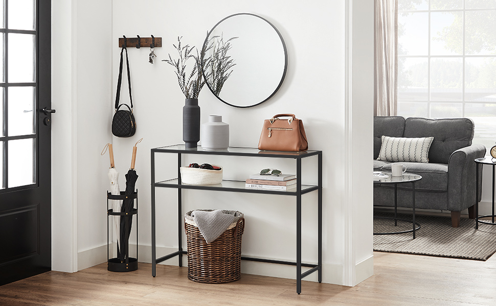 VASAGLE Masa de intrare, pe 2 nivele, blat din sticla securizata, cadru metalic, 35x100x80cm, negru