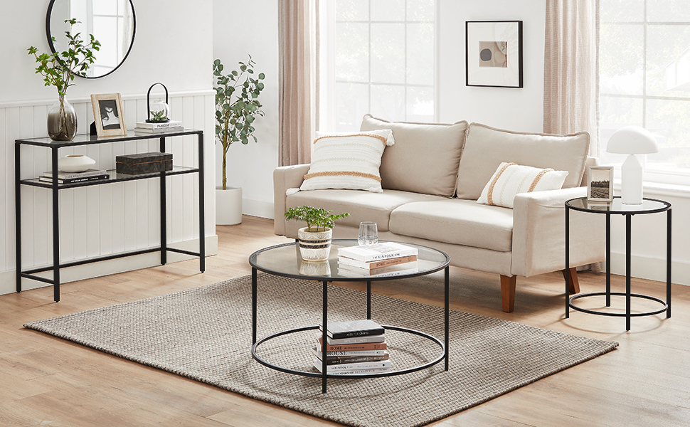 Specificatii: Culoare: Negru Material: Otel, sticla Dimensiunea produsului: 100 x 35 x 80 cm (L x l x a) Greutatea produsului: 13,8 kg Max. Sarcina statica a fiecarui raft: 20 kg Despre acest articol Duceti-va casa la un alt nivel cu o masa consola moderna care combina otelul metalic negru si un blat din sticla calita intr-o singura piesa minimalista, dar functionala. Fie ca este la intrare, in spatele canapelei, in dormitor sau ascunsa sub scari, aceasta masa din sticla  aduce un strop de eleganta si se potriveste perfect datorita designului sau simplu.Fiecare raft din sticla calita cu grosimea de 5 mm este asezat in varful cadrului din otel al acestei mese consola de 35 x 100 x 80 cm (L x l x H), oferind un suport solid pentru o greutate de pana la 30 kg.Instructiunile ilustrate si piesele numerotate va permit sa finalizati asamblarea acestei mese tip consola fara efort.