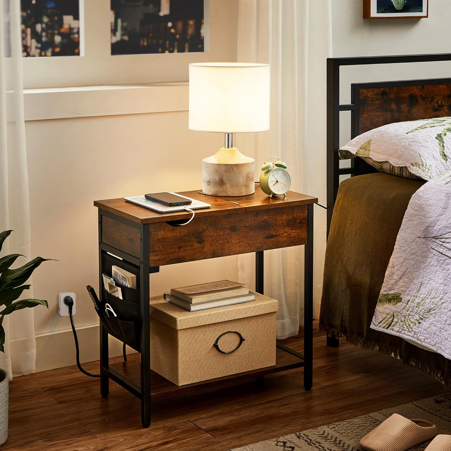 VASAGLE Masa laterala pliabila, tip noptiera, cu prize si porturi USB, raft si geanta din textil, 60x32x60 cm, maro rustic