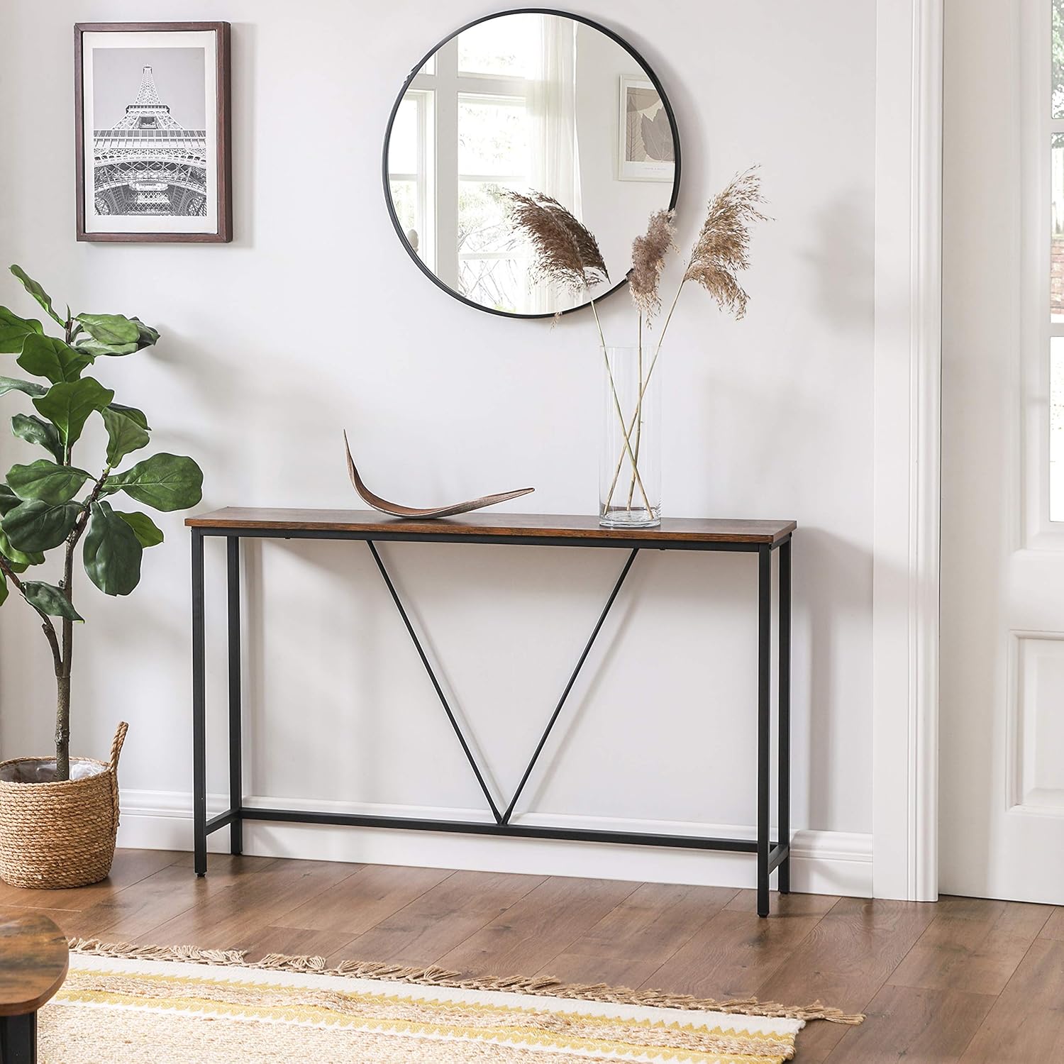 Specificatii tehnice Brand: VASAGLE Colectie/Model: Alinru, LNT020B01 Culoare: Maro vintage/negru Material blat: PAL (E1) Material cadru: Metal Dimensiuni produs: 120 x 23 x 74 cm Greutate maxima sustinuta: 15 kg Asamblare necesara: Da Scurta descriere Consola VASAGLE Alinru imbina stilul industrial cu functionalitatea, avand cadru metalic stabil si blat din PAL maro vintage. Se potriveste perfect in hol, living, dormitor sau chiar balcon, oferind un suport elegant pentru decoratiuni, fotografii sau plante. Caracteristici principale Design industrial cu finisaj maro vintage si cadru negru mat Structura solida din metal si PAL rezistent Dimensiuni compacte, potrivite pentru spatii inguste Versatila – utilizabila in hol, living, dormitor sau balcon Montaj rapid si simplu datorita partilor etichetate Include sistem de prindere anti-rabatere pentru siguranta