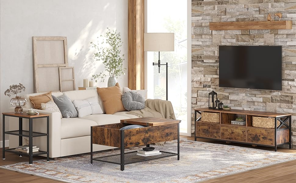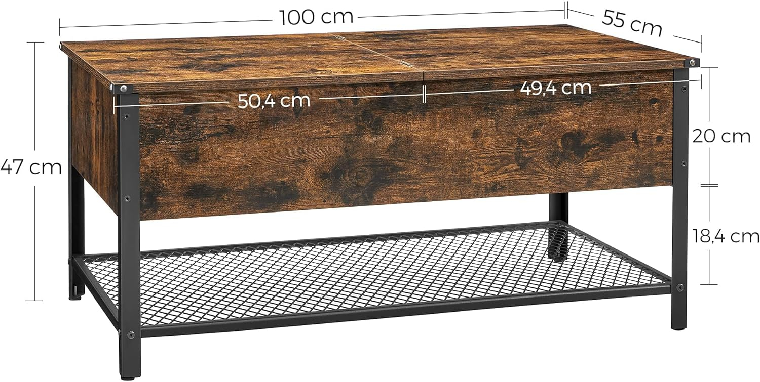VASAGLE Masuta de cafea cu capac rabatabil, compartiment depozitare ascuns si raft plasa, industrial, 100x55x47cm, maro rustic si negru