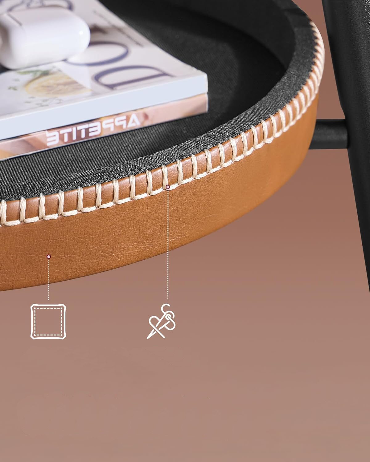 Detalii produs: Culoare: Maro cenusa-maro caramel Material: Otel, piele artificiala PU (poliuretan), placi aglomerate Dimensiuni: 70 x 70 x 91 cm (L x L x H) Dimensiunea blatului mesei: 60 cm Capacitate totala maxima de incarcare statica: 55 kg Capacitate maxima de incarcare statica a blatului mesei: 46 kg Capacitate maxima de incarcare statica a raftului inferior: 9 kg Despre acest articol Stilul conteaza:  Aceasta masa de bar din colectia noastra VASAGLE combina pielea artificiala cu cusaturi rafinate. Ca un omagiu adus mestesugului, el creeaza o locuinta care spune multe despre stilul tau. Tava practica in partea de jos:  Cu tava de sub blatul mesei, puteti crea ordine pe blatul dvs. de lucru. Cu un diametru de 40 cm si o adancime de 2,8 cm, tava acestei mese in picioare este perfecta pentru depozitarea maruntisurilor tale. Stabilitatea are prioritate:  Aceasta masa de bucatarie este foarte rezistenta si are picioare puternice care ofera o baza solida. Picioarele universale reglabile nu numai ca ofera un plus de stabilitate, dar va protejeaza si podeaua de zgarieturi. Versatila:  Fie in sufragerie, bucatarie sau camera de zi, aceasta masa rotunda este ideala pentru intalniri sociale sau pur si simplu pentru a savura cafea sau bauturi. De asemenea, poate fi folosita si ca o statie de lucru temporara. Usor de asamblat:  Nu trebuie sa aveti de-a face cu instructiuni complicate. Aceasta masa de bar neagra poate fi montata in 4 pasi simpli. Gata pentru cafeaua de recompensa!