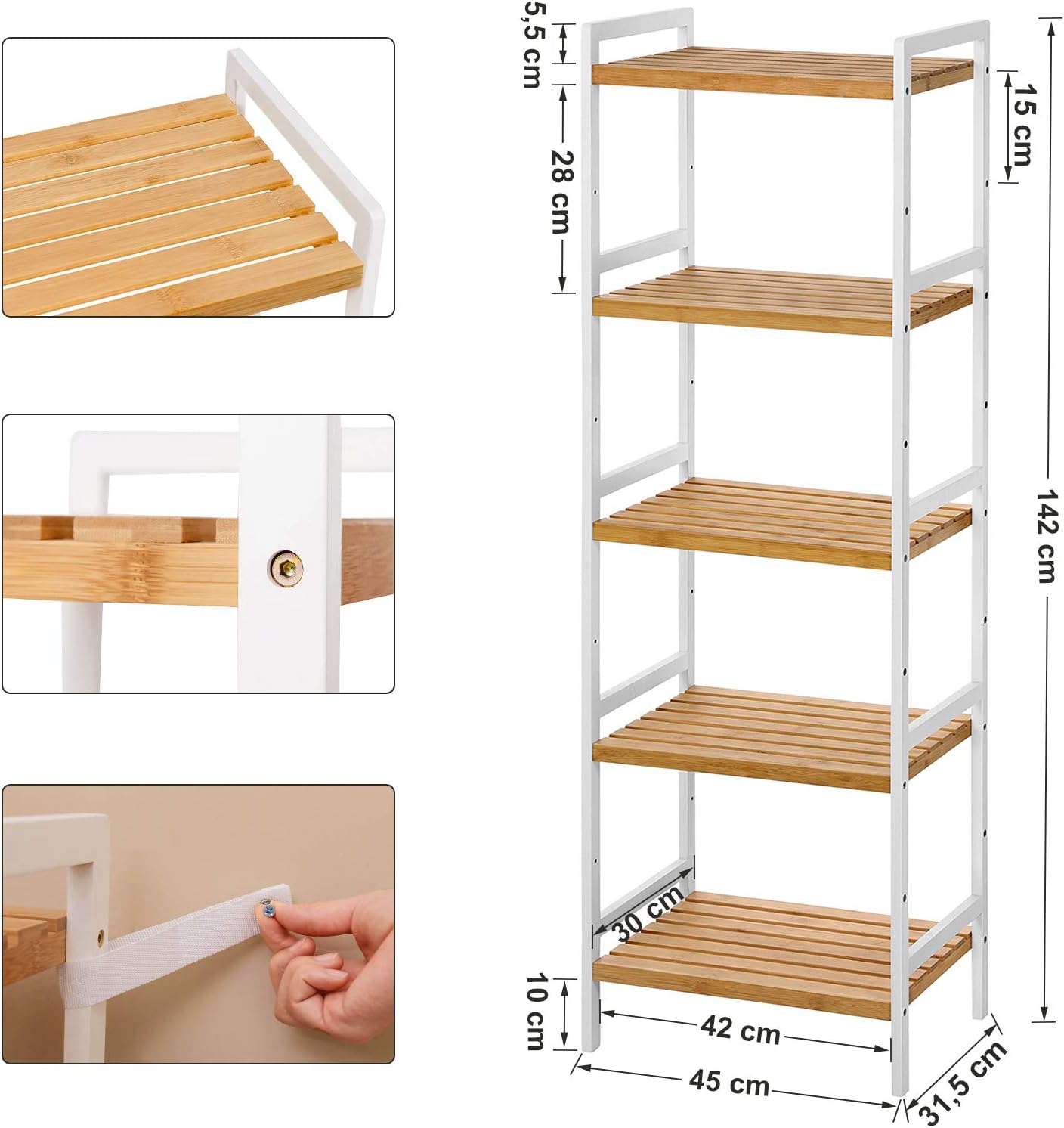 SONGMICS Etajera bambus 5 rafturi, pentru baie, bucatarie sau living, 45x32x142 cm, alb natur