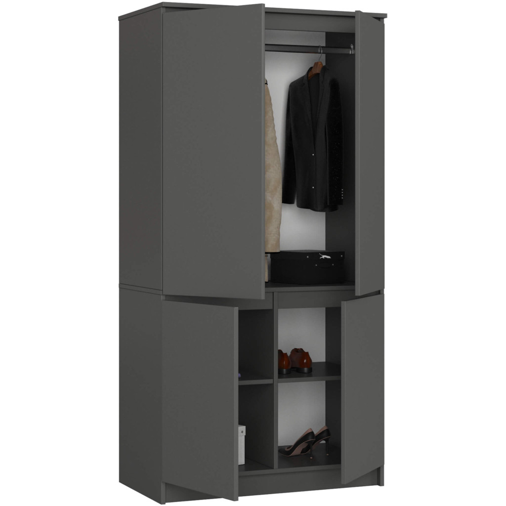 Dulap cu 4 usi, rafturi si bara pentru umerase, PAL laminat, 90x51x180 cm, gri grafit