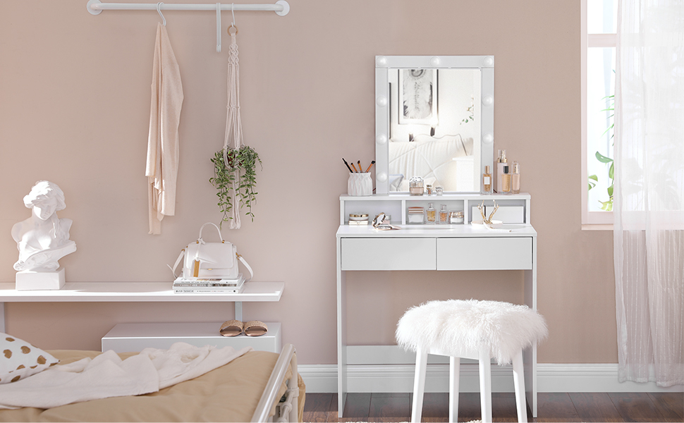 Atentie! Nu sunt incluse taburetul si alte decoratiuni  Culoare: alba Dimensiuni: 40 x 80 x 145 cm Dimensiunile produsului: 40D x 80W x 145H cm Marca: VASAGLE Despre acest articol Fara cusur. Spuneti adio machiajului estompat care va strica intregul look. Cele 9 becuri reglabile care inconjoara oglinda iti lumineaza zona de infrumusetare si fac posibil un eyeliner perfect.Totul acolo: Te-ai saturat sa iti cauti machiajul in fiecare zi? Nicio problema. Fardurile de ochi si pudra se afla acum in cele doua sertare mari, lacul de unghii este bine protejat in cele 3 compartimente deschise, iar sticlutele de parfum pot fi asezate pe raftul inaltat.Incepeti ziua cu bucurie: designul modern si culoarea deschisa a acestei masute cosmetice va vor pune mereu un zambet pe fata. Folositi bijuteria pentru a incerca cele mai noi trucuri de machiaj.Intotdeauna in forma: daca dupa ce v-ati aplicat machiajul sunteti socata sa constatati ca exista pete de machiaj pe aceasta masa de toaleta, va putem linisti. Aceasta are un strat de melamina care este usor de curatat.Continut: o masuta de toaleta cu becuri, elemente numerotate si instructiuni usor de urmat (limba engleza nu este garantata). Veti primi, de asemenea, un dispozitiv anti-inclinare si o ocazie excelenta de a va relaxa si de a va pregati.
