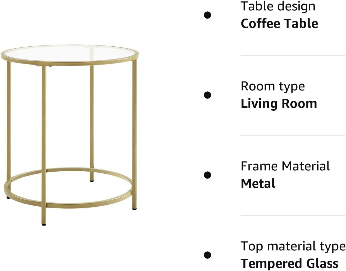 VASAGLE Masa rotunda, din sticla securizata cu cadru de otel, noptiera, 50x50x55cm, auriu