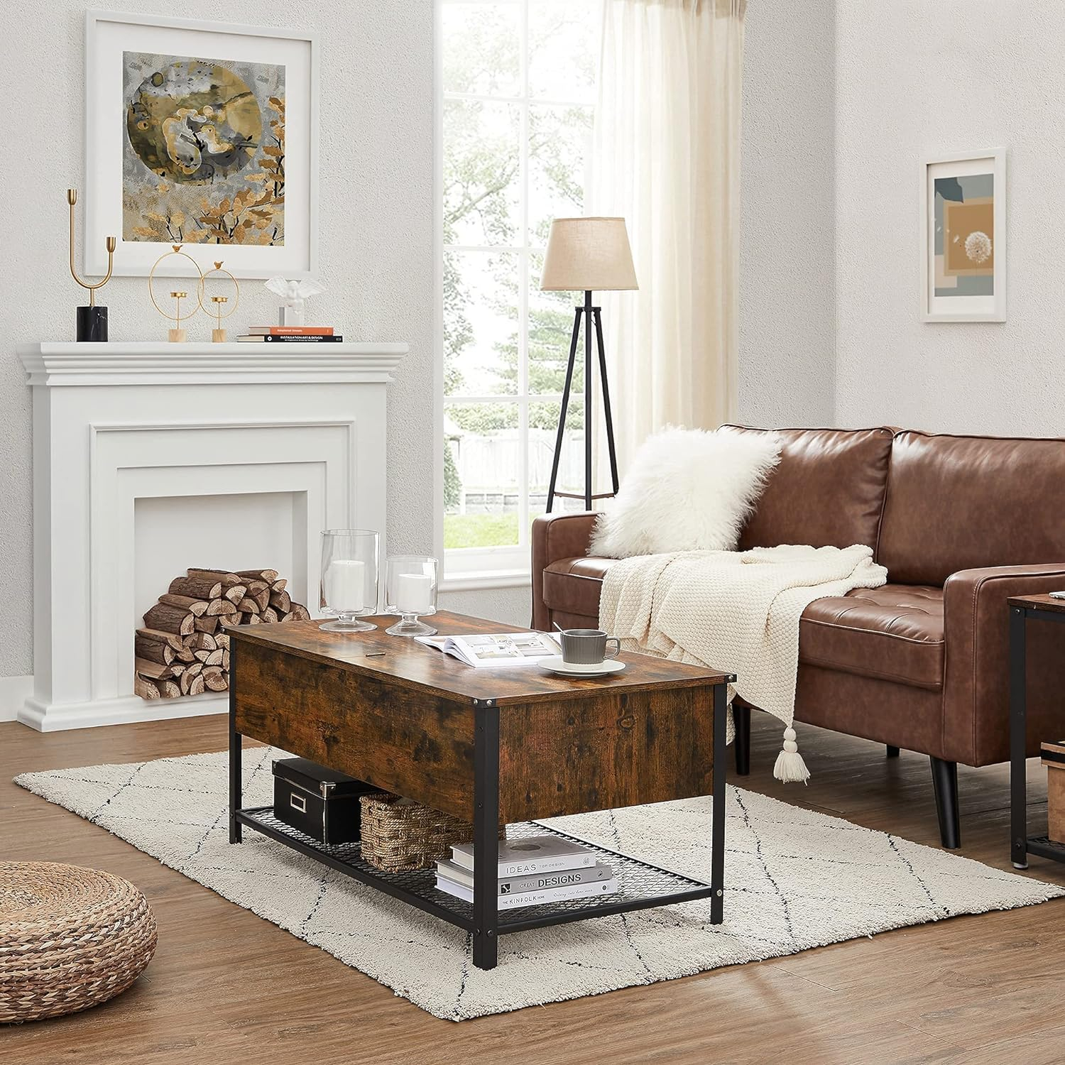 VASAGLE Masuta de cafea cu capac rabatabil, compartiment depozitare ascuns si raft plasa, industrial, 100x55x47cm, maro rustic si negru