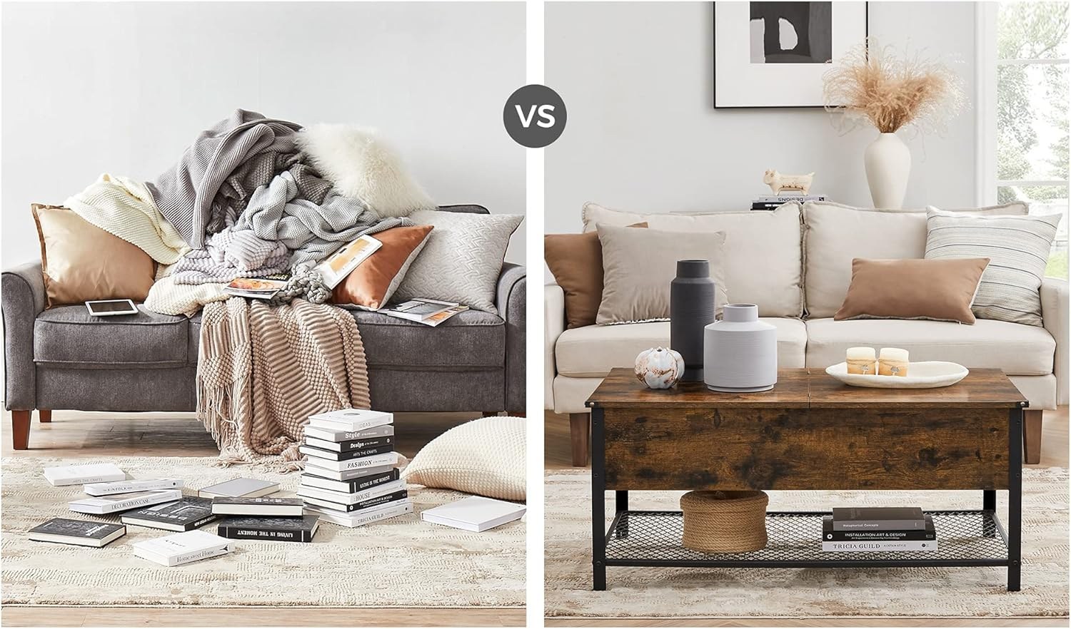 Dimensiunile produsului: 100D x 55W x 47H cm Culoare: Maro Marca: VASAGLE Despre acest articol Spatiu pentru afisare, ascundere si organizare: bauturi si gustari pe raftul mare de sus; paturi, perne, jocuri de societate in compartimentul inchis; E loc pentru orice pe aceasta masuta de cafea. Blatul de masa face diferenta:   Acest blat de masa mare de 100 x 55 cm ofera mai mult! Este, de asemenea, un capac cu partea rabatabila cu 1 cm mai lunga decat partea fixa, astfel incat poate fi ridicat sau coborat cu usurinta. Un membru al familiei tale: aceasta masuta de cafea va fi un partener de incredere in camera ta de zi pentru a servi timpul petrecut cu familia ta, datorita otelului robust, placilor solide si picioarelor reglabile; rezistand testului timpului, in curand va fi unul dintre voi!Spatiul mare te face multumit, dar aspectul fermecator al stilului vintage asortat de raftul din plasa te impresioneaza, este masuta de cafea, atat tu, cat si oaspetii tai sunteti predispusi la „WOW-uri”. Ce primesti: o masuta de cafea vintage cu un blat spatios si un compartiment ascuns, piese numerotate si instructiuni usor de urmat pentru asamblare cu usurinta, iti aduc fericire chiar de la inceput.