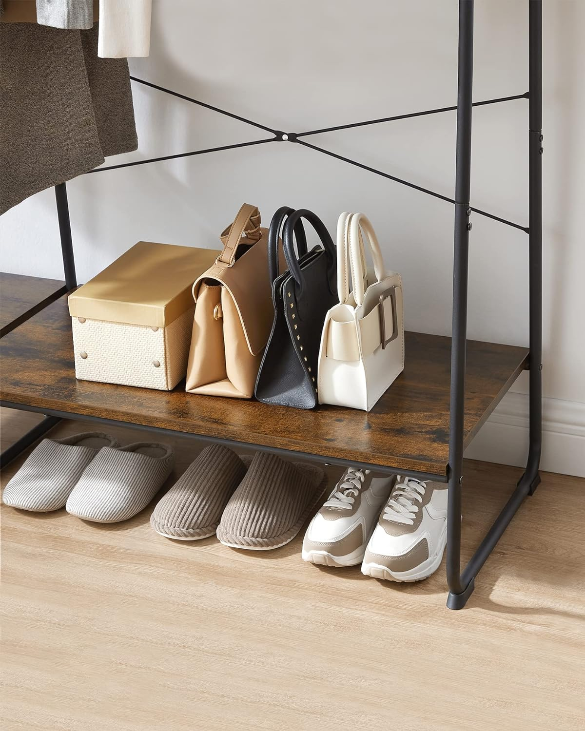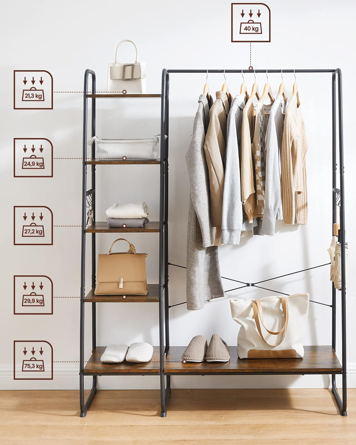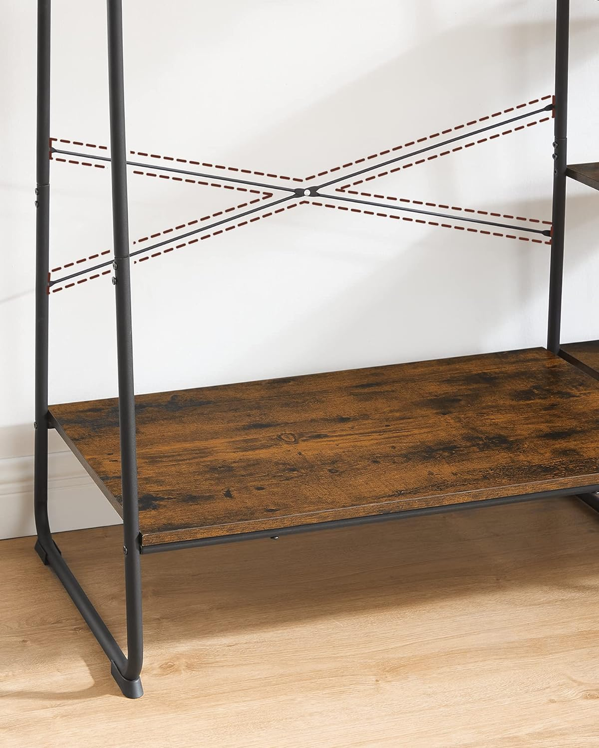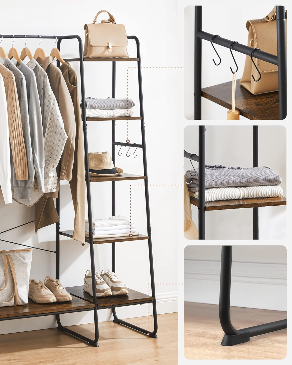 VASAGLE Raft pentru haine cu suport pentru pantofi, 5 polite, 6 carlige laterale, 45x120x160cm, maro rustic si negru