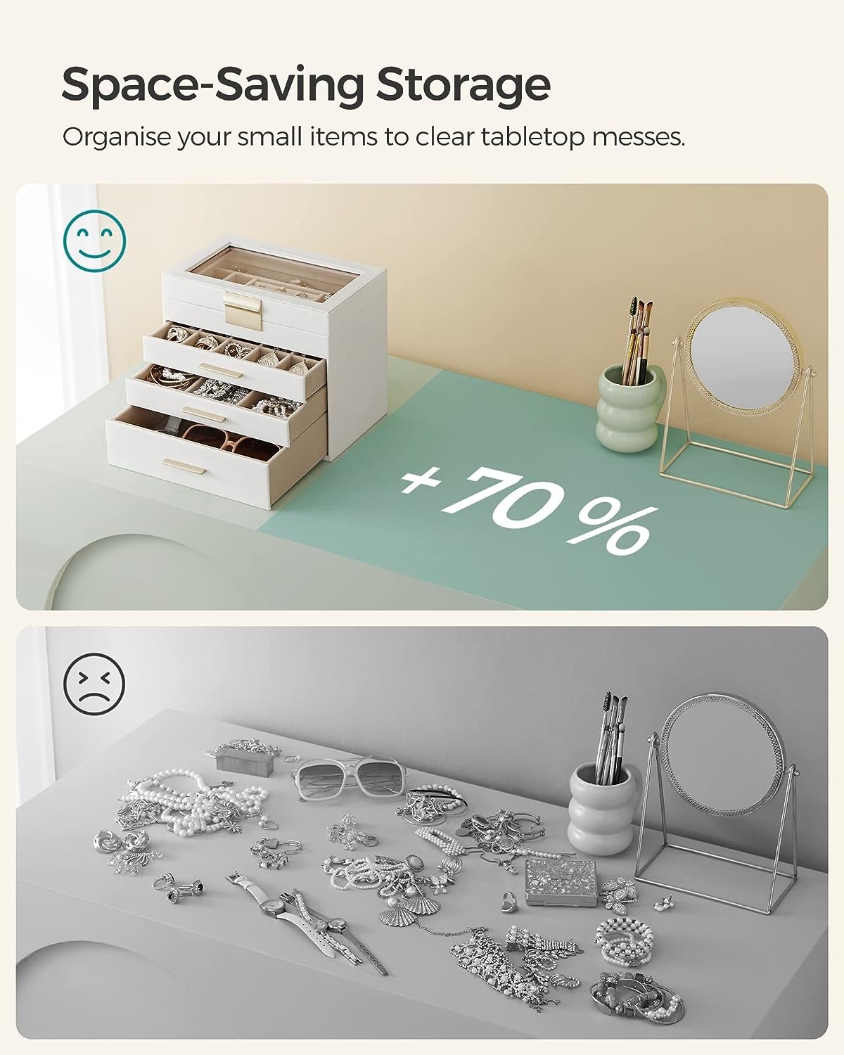 SONGMICS Cutie de bijuterii cu 4 nivele, 3 sertare, capac din sticla, 22x25x15cm, alb si auriu