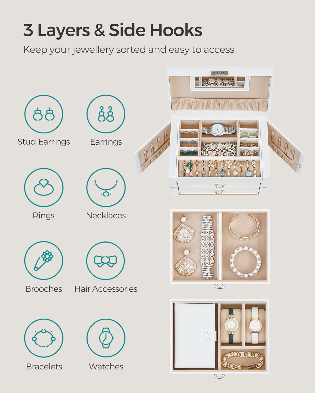 SONGMICS Cutie de bijuterii pe 3 nivele, 2 sertare, maner, inchidere cu cheie, 18x26x17cm, alb