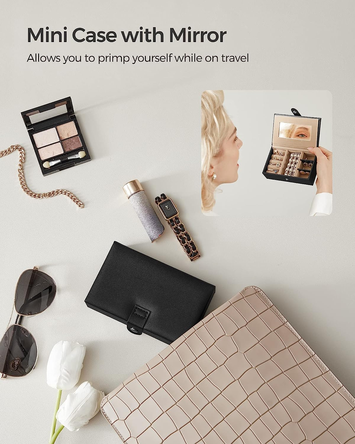 Culoare: Negru Marca: Songmics Material: piele din piele + cadru din fibra de densitate medie + catifea Stil: Modern Caracteristica speciala: oglinda, lacat, portabil Dimensiunile...