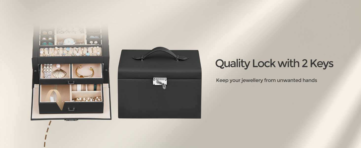 SONGMICS Cutie de bijuterii pe 3 nivele, cu 2 sertare, oglinda, maner, inchidere cu cheie, 18x26x17cm, negru